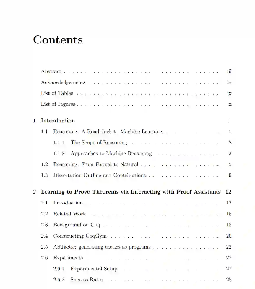 深度神经网络在许多任务上取得了卓越的性能,如物体识别、语言理解和自动驾驶。然而,他们仍然在推理任务中挣扎,这些任务通常需要操作符号并将多个步骤组合起来,例如,求解数学方程或编写计算机程序。在这篇论文中,我们的目标是弥合这一差距,并教机器以精确、系统、可解释和鲁棒的方式进行推理,以应对现实环境中的模糊性。**本文采用神经符号方法,结合机器学习和符号推理的互补优势。符号推理具有精确性和系统性。**但它已被限制在可严格形式化的领域。相比之下,主要的机器学习方法很灵活,但众所周知难以解释,需要大量数据,并且无法在训练分布之外进行泛化。集成两种方法的优势对于构建具有精确和系统泛化能力的灵活推理机至关重要。具体而言,本文从两个角度研究了神经符号推理。首先,将机器学习应用于与符号推理相关的任务,如自动定理证明(第2章)。其次,将符号推理启发的归纳偏差引入机器学习模型,以提高其可解释性、泛化性和数据效率(第3章和第4章)。结果强调了(1)神经符号模型架构,(2)在适当的抽象水平上进行推理,以及(3)明确的、推理的组合表示,如符号证明。 https://dataspace.princeton.edu/handle/88435/dsp015q47rr958