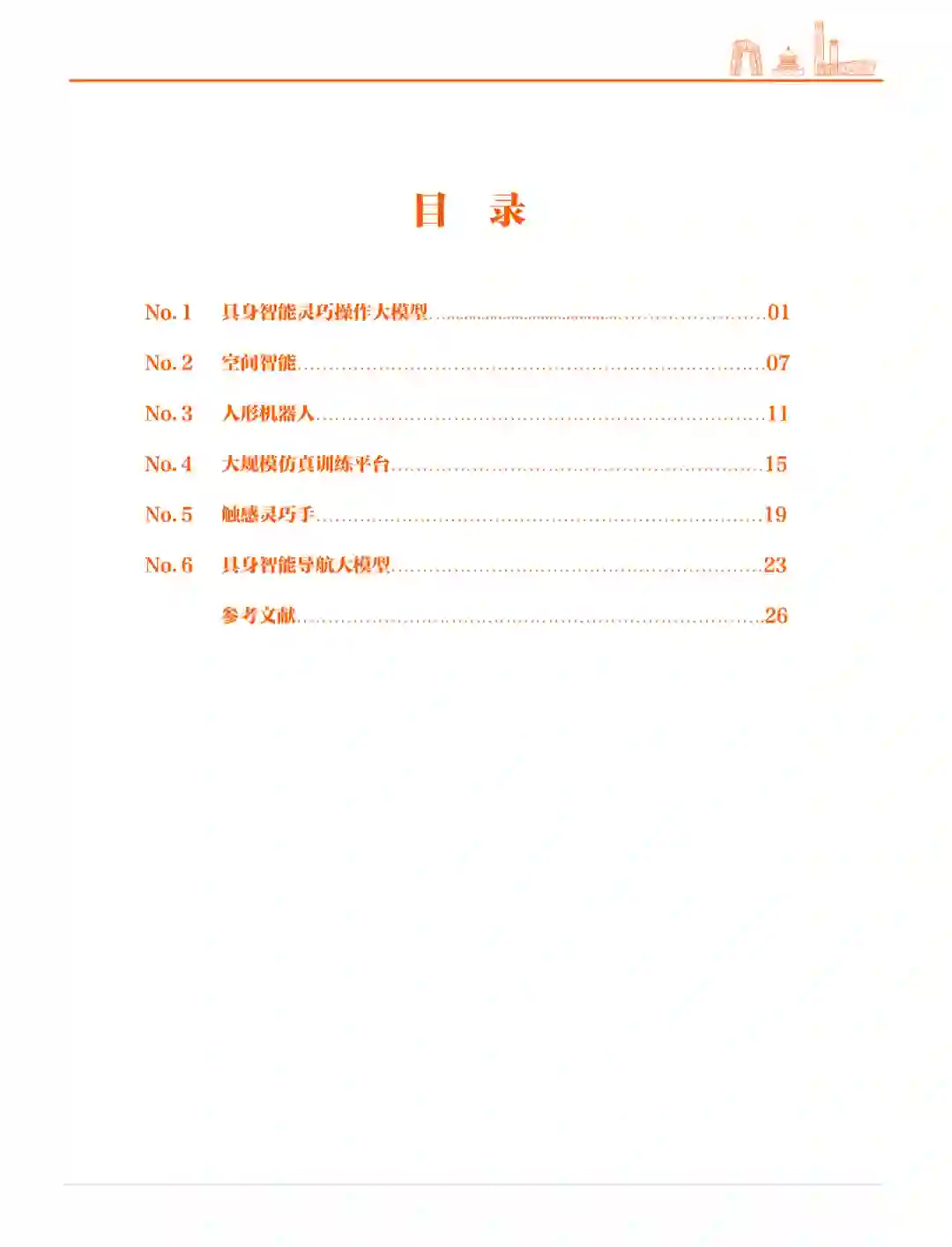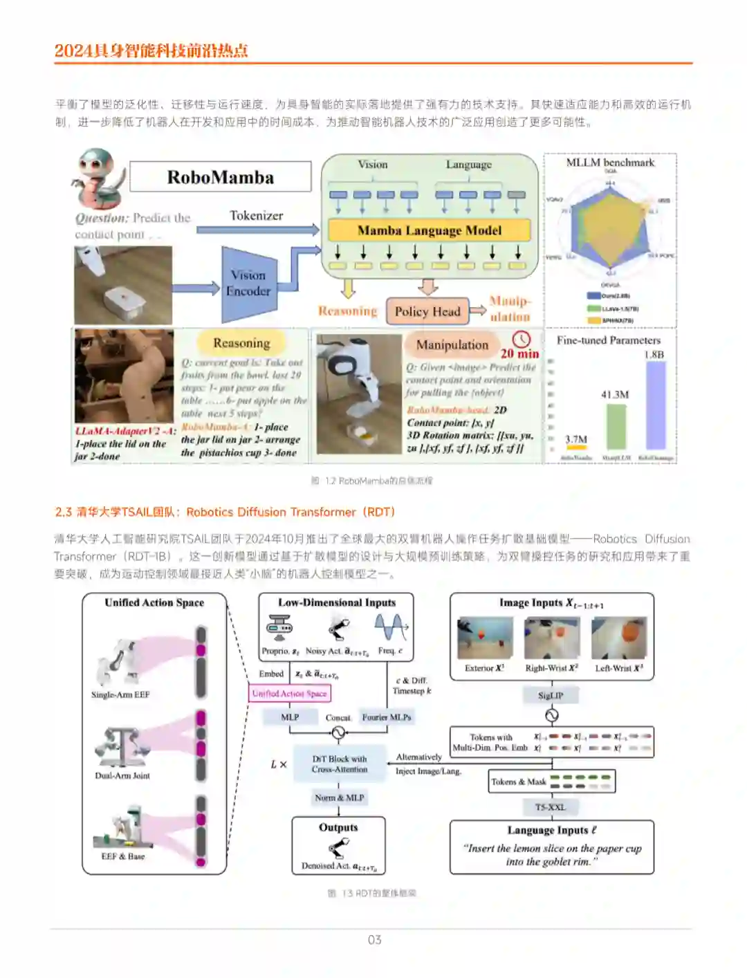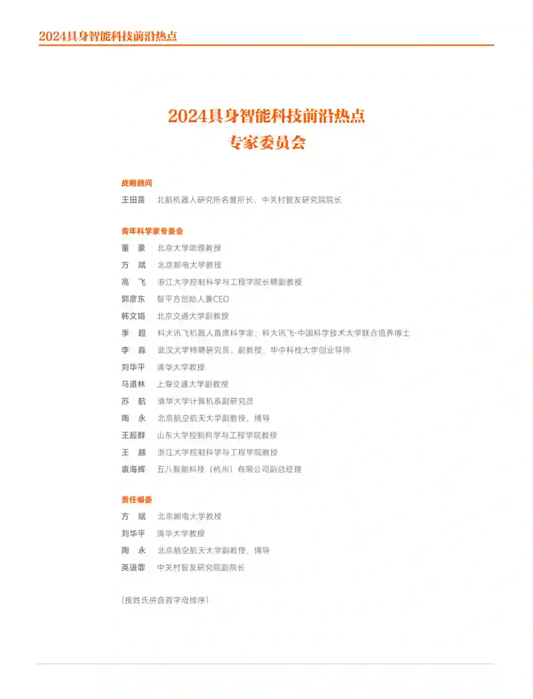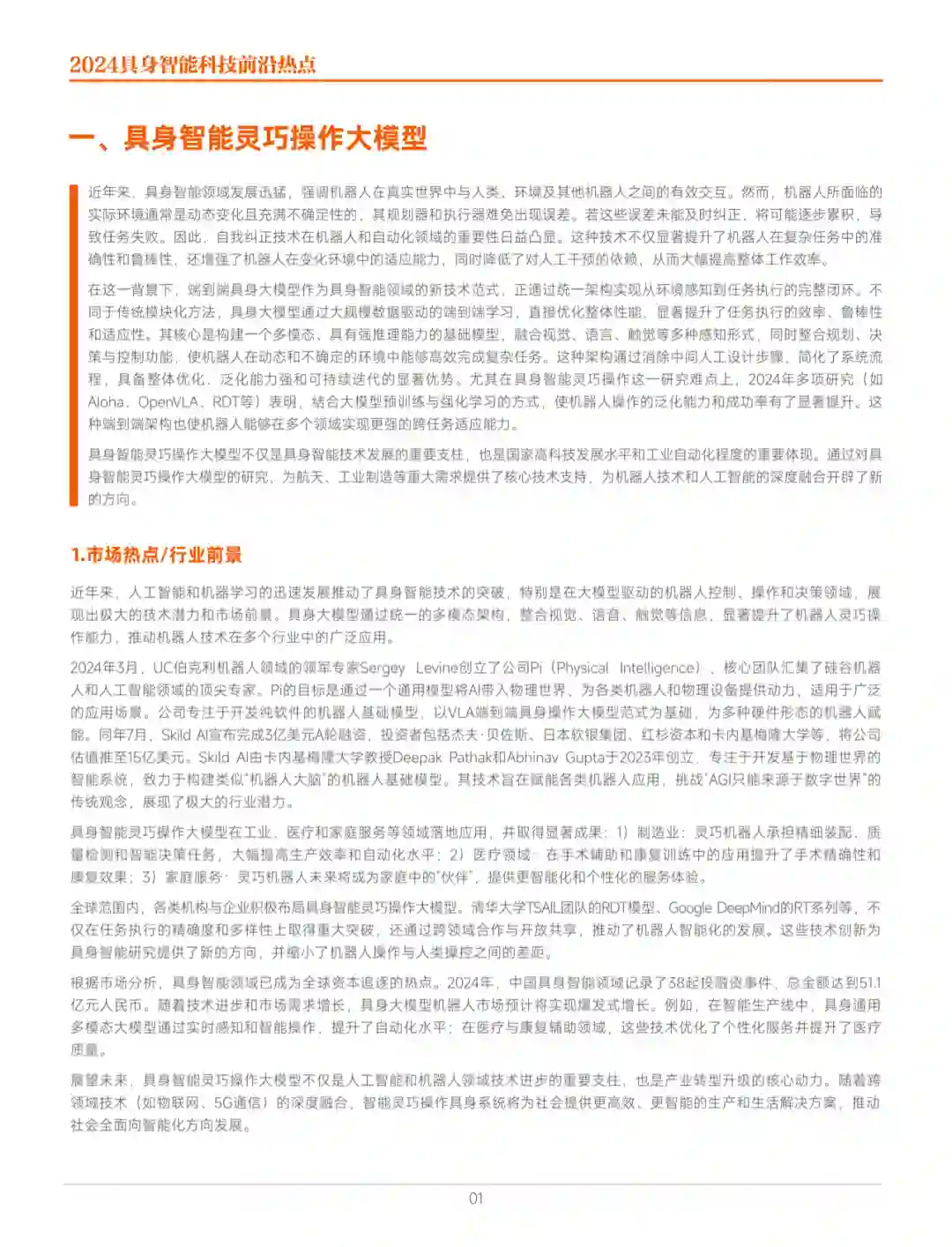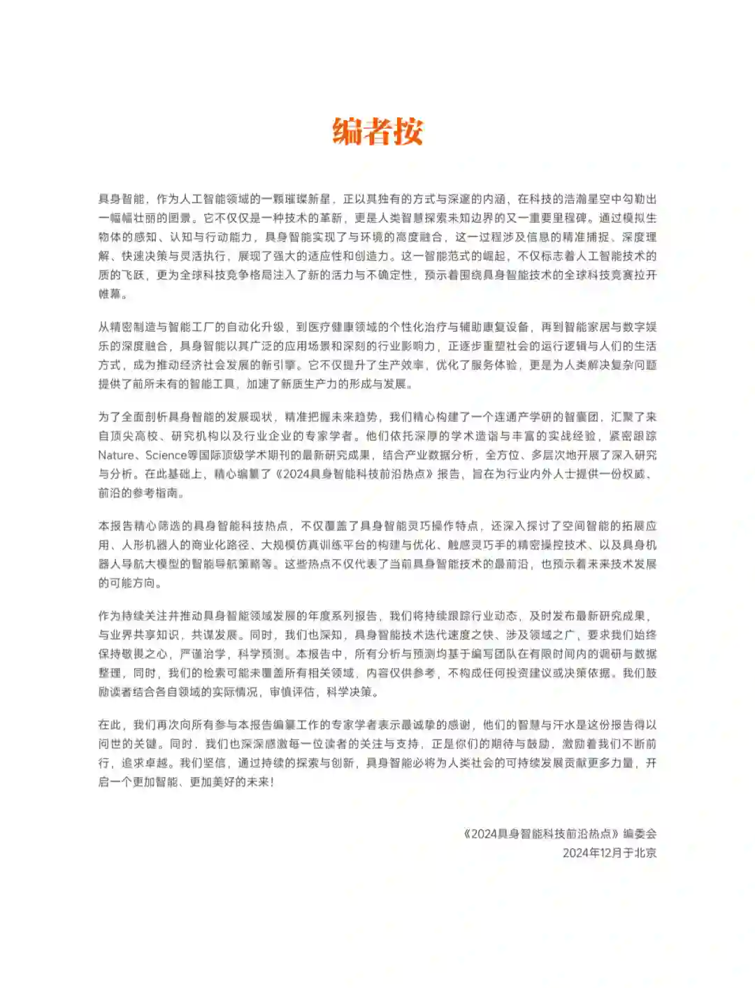 具身智能,作为人工智能领域的一颗璀璨新星,正以其独有的方式与深邃的内涵,在科技的浩瀚星空中勾勒出 一幅幅壮丽的图景。它不仅仅是一种技术的革新,更是人类智慧探索未知边界的又一重要里程碑。通过模拟生 物体的感知、认知与行动能力,具身智能实现了与环境的高度融合,这一过程涉及信息的精准捕捉、深度理 解、快速决策与灵活执行,展现了强大的适应性和创造力。这一智能范式的崛起,不仅标志着人工智能技术的 质的飞跃,更为全球科技竞争格局注入了新的活力与不确定性,预示着围绕具身智能技术的全球科技竞赛拉开 帷幕。 从精密制造与智能工厂的自动化升级,到医疗健康领域的个性化治疗与辅助康复设备,再到智能家居与数字娱 乐的深度融合,具身智能以其广泛的应用场景和深刻的行业影响力,正逐步重塑社会的运行逻辑与人们的生活 方式,成为推动经济社会发展的新引擎。它不仅提升了生产效率,优化了服务体验,更是为人类解决复杂问题 提供了前所未有的智能工具,加速了新质生产力的形成与发展。 为了全面剖析具身智能的发展现状,精准把握未来趋势,我们精心构建了一个连通产学研的智囊团,汇聚了来 自顶尖高校、研究机构以及行业企业的专家学者。他们依托深厚的学术造诣与丰富的实战经验,紧密跟踪 Nature、Science等国际顶级学术期刊的最新研究成果,结合产业数据分析,全方位、多层次地开展了深入研究 与分析。在此基础上,精心编纂了《2024具身智能科技前沿热点》报告,旨在为行业内外人士提供一份权威、 前沿的参考指南。 本报告精心筛选的具身智能科技热点,不仅覆盖了具身智能灵巧操作特点,还深入探讨了空间智能的拓展应 用、人形机器人的商业化路径、大规模仿真训练平台的构建与优化、触感灵巧手的精密操控技术、以及具身机 器人导航大模型的智能导航策略等。这些热点不仅代表了当前具身智能技术的最前沿,也预示着未来技术发展 的可能方向。 作为持续关注并推动具身智能领域发展的年度系列报告,我们将持续跟踪行业动态,及时发布最新研究成果, 与业界共享知识,共谋发展。同时,我们也深知,具身智能技术迭代速度之快、涉及领域之广,要求我们始终 保持敬畏之心,严谨治学,科学预测。本报告中,所有分析与预测均基于编写团队在有限时间内的调研与数据 整理,同时,我们的检索可能未覆盖所有相关领域,内容仅供参考,不构成任何投资建议或决策依据。我们鼓 励读者结合各自领域的实际情况,审慎评估,科学决策。 在此,我们再次向所有参与本报告编纂工作的专家学者表示最诚挚的感谢,他们的智慧与汗水是这份报告得以 问世的关键。同时,我们也深深感激每一位读者的关注与支持,正是你们的期待与鼓励,激励着我们不断前 行,追求卓越。我们坚信,通过持续的探索与创新,具身智能必将为人类社会的可持续发展贡献更多力量,开 启一个更加智能、更加美好的未来!