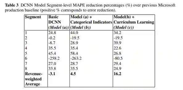 介绍了一个真实案例研究,摘自微软 [19] 进行的研究。开发了特定方法来预测与企业和中小型企业 (SMC) 产品相对应的 Microsoft 收入数据,这些数据跨越全球约 60 个地区,涉及 8 个不同的业务部门,总计数百亿美元。特别是,这种时间序列预测是通过借鉴自然语言处理(编码器-解码器 LSTM)和计算机视觉(扩张 CNN)的深度学习技术来完成的。对于这两种技术,都引入了课程学习训练制度,该制度在越来越难以预测的趋势线上进行训练。相对于微软以前使用传统技术的基线预测模型,由此产生的预测在测试数据的整体准确性上提高了 30%。