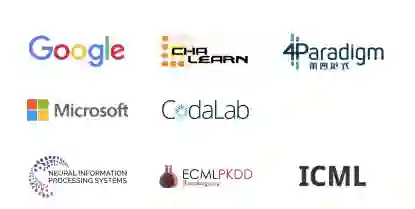 图1.3 本论文期间的合作。谷歌、4Paradigm和微软提供技术支持和GPU积分。ChaLearn是领导组织AutoDL挑战的非营利组织。挑战赛的结果在与NeurIPS 2019、ECML PKDD 2019、ICLR 2020和ICML 2020等会议同地举行的研讨会上分享。