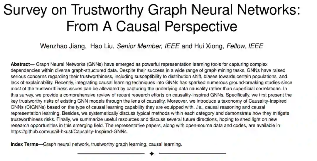 图神经网络(GNNs)已经成为捕捉复杂依赖关系的强大表示学习工具,在多样化的图结构数据中表现出色。尽管在广泛的图挖掘任务中取得了成功,但GNNs也引起了关于其可信度的严重担忧,包括对分布变化的敏感性、对特定人群的偏见,以及缺乏可解释性。最近,将因果学习技术融入GNNs激发了许多开创性的研究,因为大多数可信度问题可以通过捕捉数据的底层因果性而非表面相关性来缓解。在这篇综述中,我们提供了对受因果性启发的GNNs最新研究努力的全面回顾。具体来说,我们首先通过因果性的视角介绍现有GNN模型的关键可信风险。此外,我们基于它们所配备的因果学习能力类型,即因果推理和因果表示学习,介绍了受因果性启发的GNNs(CIGNNs)的分类。除此之外,我们系统地讨论了每个类别中的典型方法,并展示了它们如何减轻可信风险。最后,我们总结了有用的资源,并讨论了几个未来的方向,希望能为这一新兴领域的新研究机会提供启示。代表性论文以及开源数据和代码可在https://github.com/usail-hkust/Causality-Inspired-GNNs找到。