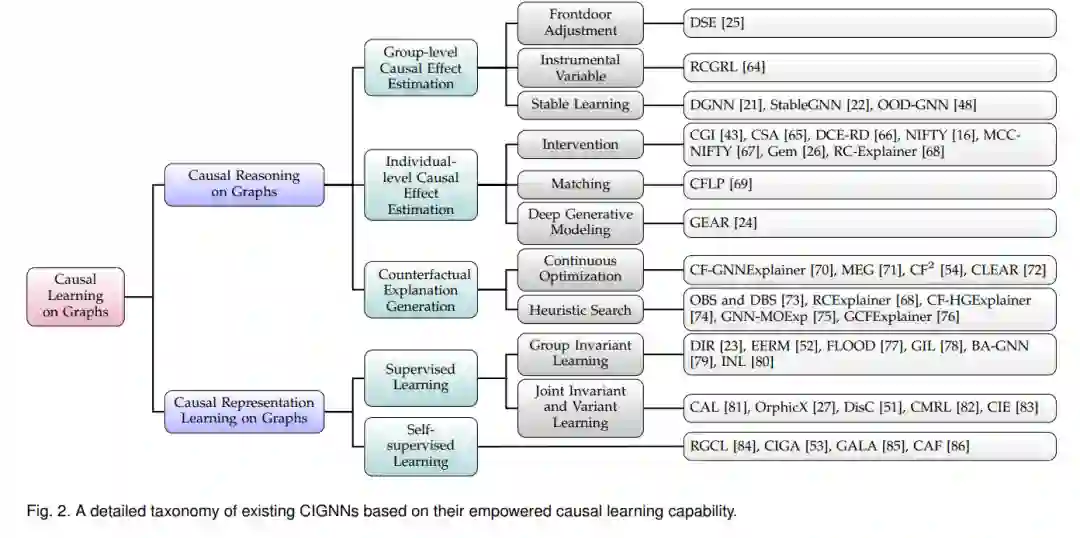 我们还从现有的CIGNNs中发现了一个共性,即它们可信度的提高可归因于为GNNs配备特定的因果学习能力。受此事实启发,我们根据以下两组因果学习能力对现有工作进行分类:(i) 因果推理,以及 (ii) 因果表示学习。属于第一类的工作估计不同图组件以及其他感兴趣的结果(如标签和模型预测)之间的因果效应,并利用这种因果知识来增强GNNs的可信度。另一方面,第二类工作探索了GNNs直接从原始图数据学习因果表示的潜力,并将因果表示学习(CRL)过程无缝整合到GNN系统的标准问题解决流程中。由于将因果发现纳入GNNs的工作有限,因此在第8节作为未来方向的一部分讨论了这一观点。在每个类别内,我们进一步介绍了为GNNs配备相应因果学习能力的主流技术,并解释了这些技术如何有助于缓解不同的可信风险。值得注意的是,不同类别中提出的技术可能被结合起来,使GNNs能够同时处理多个因果学习任务,正如最近研究[25]、[27]所示。因此,我们选择根据它们主要针对的因果学习任务来分类这些工作,以避免混淆。