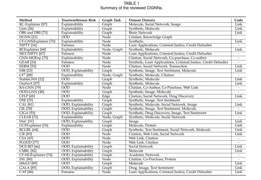 我们通过因果性的视角分析了不同可信度风险背后的理由,强调了GNNs深入理解图中潜在因果机制的重要性。从因果视角出发,我们提供了开发更健壮和可解释图挖掘解决方案的宝贵洞见。 为了更好地理解各种CIGNNs的共性和特点,我们提出了一个新的分类法,基于它们能够处理的因果学习任务的类型,包括因果推理和因果表示学习。在每个类别中,我们深入探讨了代表性方法及其对提高可信度的特定贡献,提供了这一新兴领域最先进情况的全面概述。 我们系统地编制了开源基准、数据合成策略、常用评估指标以及可用的开源代码概览。此编译旨在使探索因果性启发的想法在开发TGNNs中变得更加容易,并鼓励它们在各种下游应用中的实际实现。