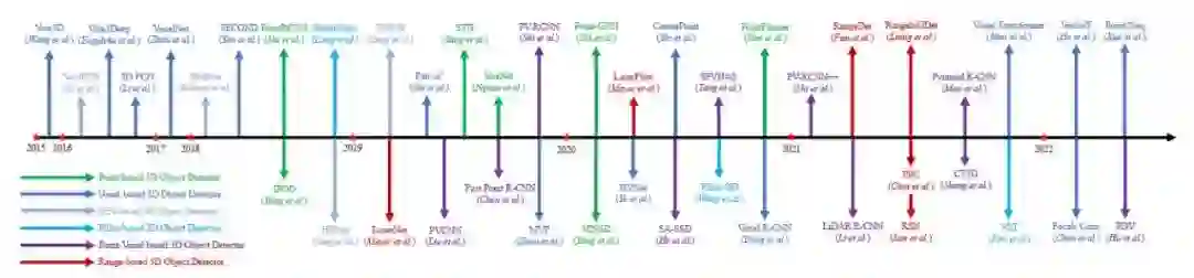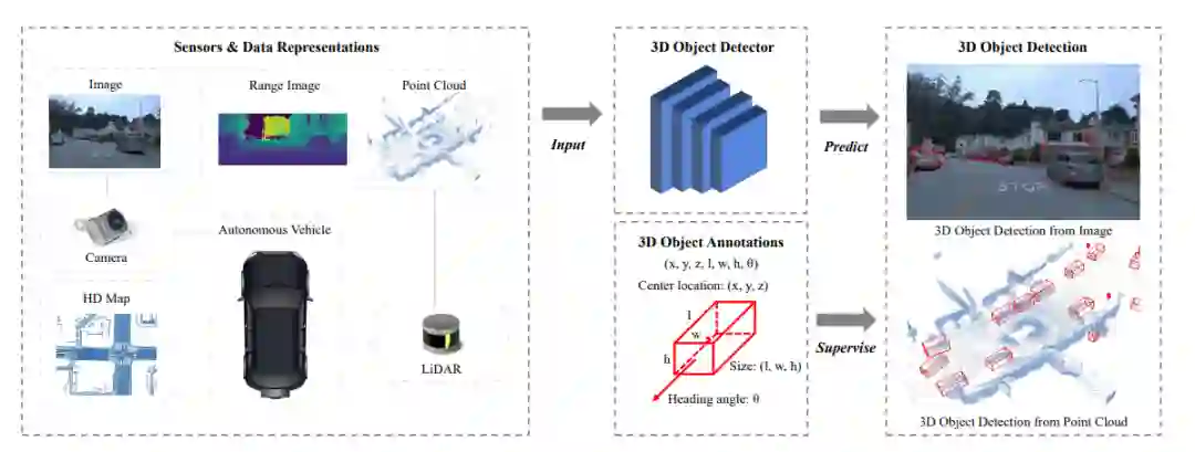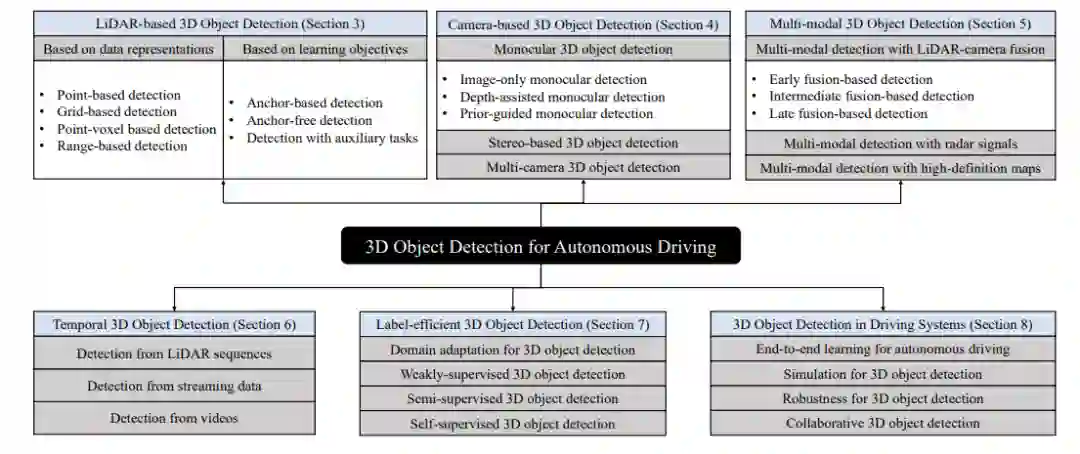 本文从不同的角度对三维物体检测方法进行了全面的综述,包括来自不同传感器输入的检测(基于激光雷达、基于相机和多模态检测)、来自时间序列的检测、标签高效检测,以及三维物体检测在驾驶系统中的应用。