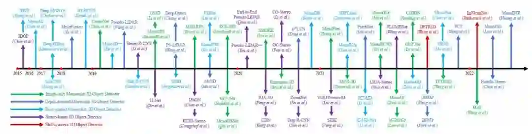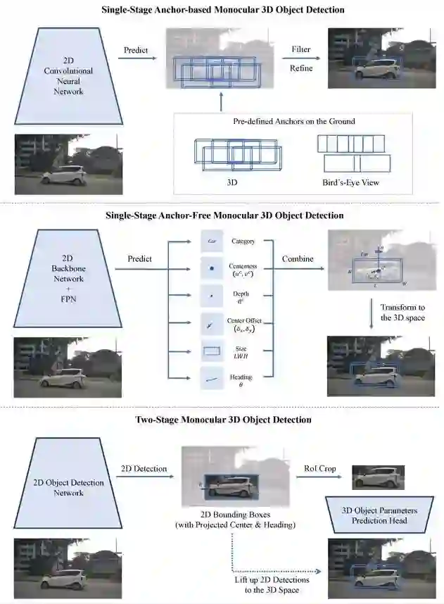 单阶段锚定方法利用图像特征和预定义的3D锚定框来预测三维物体参数。单阶段无锚方法直接从图像像素预测三维物体参数。两阶段检测方法首先由二维检测器生成二维包围盒,然后根据二维RoI特征预测三维物体参数,将二维检测提升到三维空间。