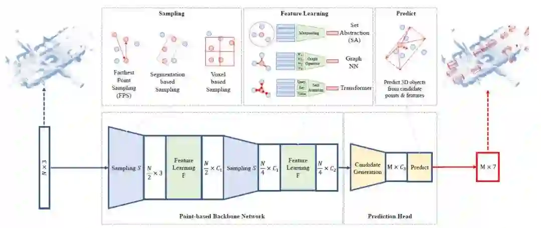 一种通用的基于点的检测框架包括基于点的骨干网和预测头。基于点的主干由多个块组成,用于点云采样和特征学习,预测头直接从候选点估计出三维边界框。