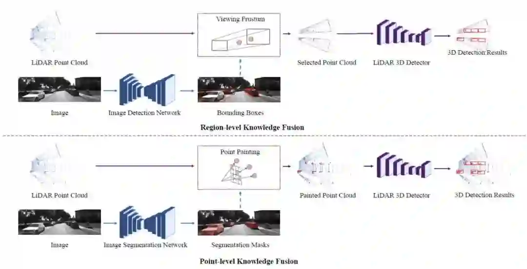 早期融合方法在点云特征通过基于激光雷达的三维物体检测器之前,利用图像信息进行增强。在区域知识融合中,首先对图像进行二维检测,生成二维边界框。然后将二维方框挤压到视锥中,选择合适的点云区域,用于后续的基于激光雷达的三维目标检测。在点级知识融合中,首先对图像进行语义分割,然后将分割结果从图像像素转移到点上,作为附加在每个点上的附加特征。最后将增强后的点云通过激光雷达探测器进行三维物体检测。