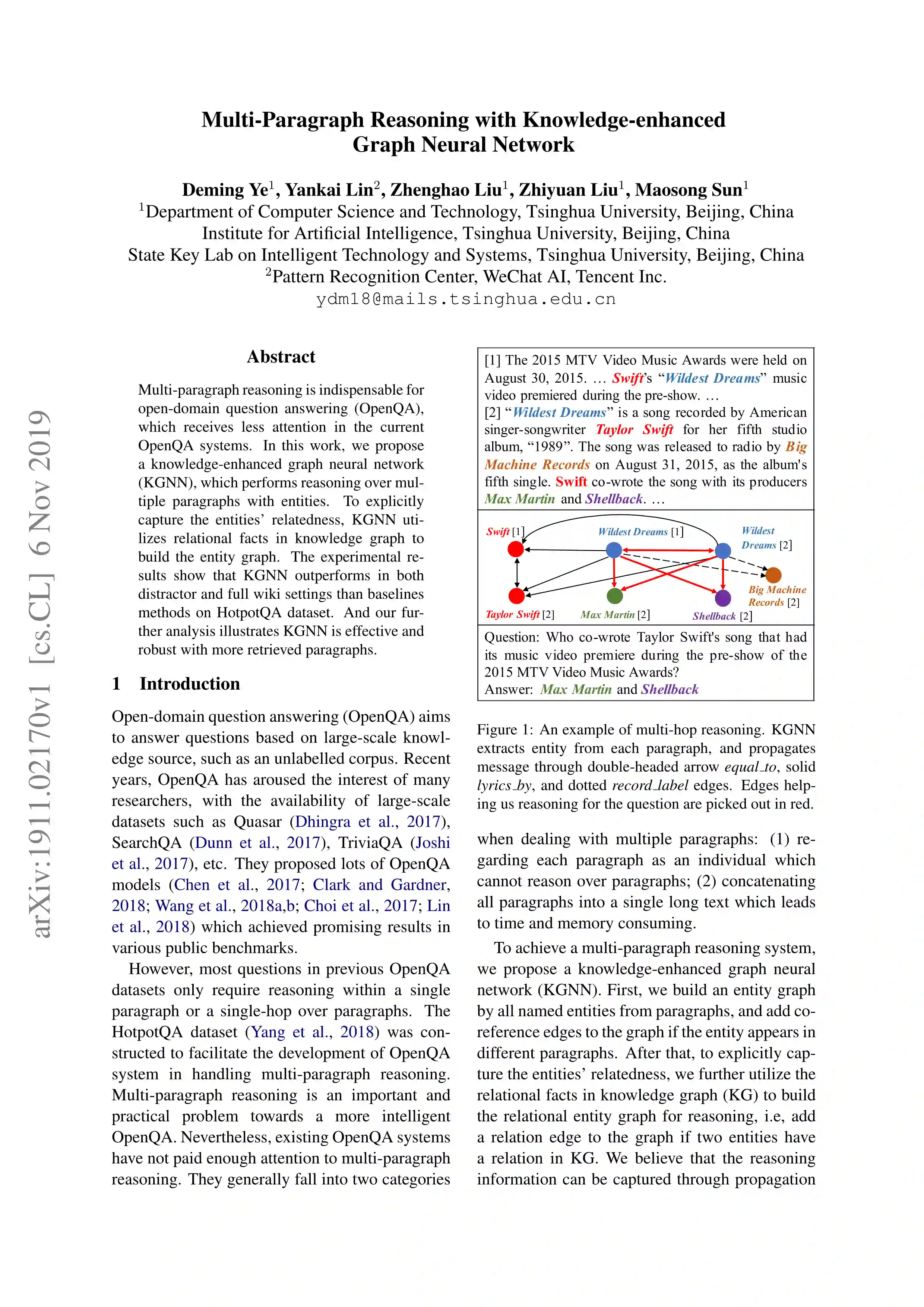 论文摘要: Multi-paragraph推理对于open-domain问答(OpenQA)是必不可少的,尽管在当前的OpenQA系统中受到的关注较少。在这项工作中,我们提出一个知识增强图神经网络(KGNN),使用实体对多个段落进行推理。为了显式地捕捉到实体的关系,KGNN利用关系事实知识图谱构建实体图谱。实验结果表明,与HotpotQA数据集上的基线方法相比,KGNN在分散注意力和完整的wiki设置方面都有更好的表现。我们进一步的分析表明,KGNN在检索更多的段落方面是有效和具有鲁棒性的。