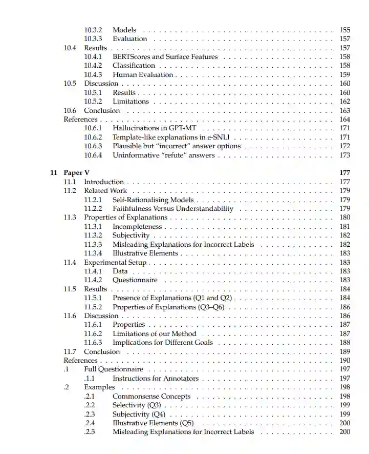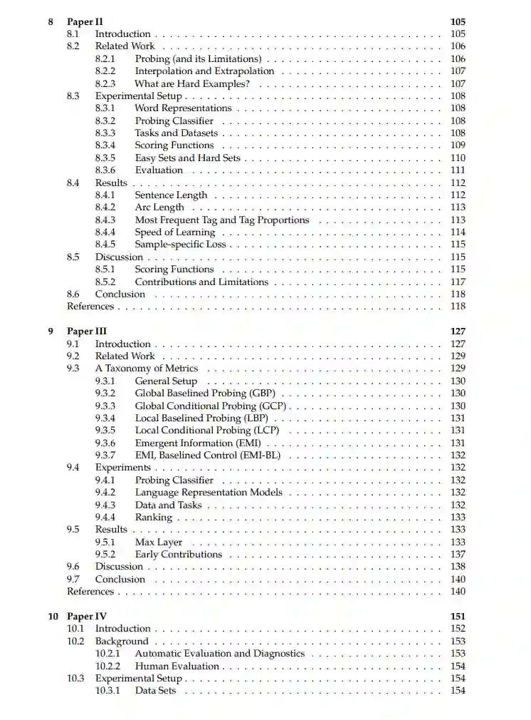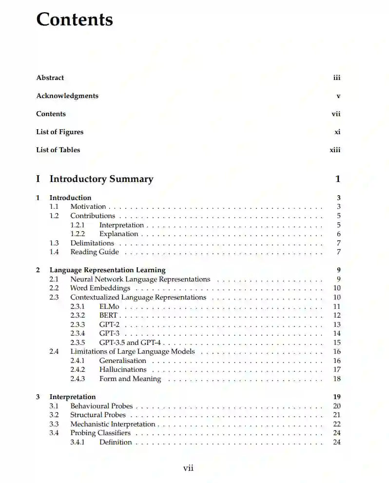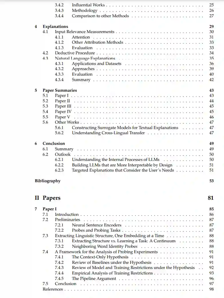 大型语言模型(LLMs)已成为许多自然语言处理(NLP)系统的基础,这得益于它们的性能和对各种任务的易适应性。然而,关于它们的内部工作原理仍有许多未知之处。LLMs拥有数百万甚至数十亿的参数,它们的大部分训练以自监督的方式进行:它们只是学习预测序列中的下一个单词或缺失的单词。这对于捕获广泛的语言、事实和关系信息非常有效,但这意味着学习的具体内容及其在LLM中的表现方式并非易事。在本论文中,我展示了我们在更好理解LLMs方面的方法贡献。这项工作可以分为两种方法。第一种位于可解释性领域,该领域关注于理解LLMs的内部工作原理。具体来说,我们分析并完善了一种名为探针分类器的工具,该工具检查LLMs的中间表示,重点是神经模型各层的作用。这有助于我们全面理解信息在模型中的结构方式。我介绍了我们在评估和改进探针方法方面的工作。我们开发了一个框架来阐明过去方法的局限性,表明所有常见的控制都不足。基于此,我们通过创建人为的分布变化提出了更严格的探针设置。我们开发了新的探针分类器评估指标,将焦点从层包含的总体信息转移到LLM中信息内容的差异。第二种方法涉及可解释性,特别是自合理化模型,这些模型生成自由文本解释以及它们的预测。这是局部可理解性的一个实例:我们获得个别预测的理由。然而,在这种设置中,解释的生成与预测的生成一样不透明。因此,我们在这一领域的工作重点是更好地理解生成解释的属性。我们评估了由不同模型管道生成的解释的下游性能,并将其与人类对解释的评价进行比较。我们的结果表明,提高下游性能的属性与人类在评估解释时所欣赏的属性不同。最后,我们对LLM生成的解释进行了注释,这些解释具有人类解释通常具有的属性,并讨论了这些属性对不同用户群体的影响。虽然对LLMs内部工作的详细理解仍然不可行,但我认为本工作中呈现的技术和分析可以帮助更好地理解LLMs、它们编码的语言知识及其决策过程。结合有关模型架构、训练数据和训练目标的知识,这些技术可以帮助我们发展对LLMs的稳健的高层理解,这可以指导关于它们部署和潜在改进的决策。