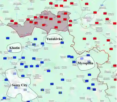 图 苏梅地区部署态势。 截至2025年6月10日评估的乌克兰在苏梅州的部署情况,显示了沿该市北部、东北部及东部接近方向上旅级和营级部队的阵地。来源:乌克兰控制区地图。
