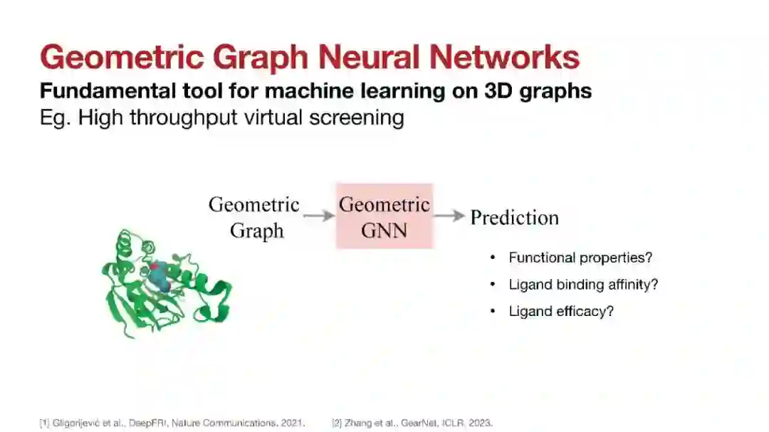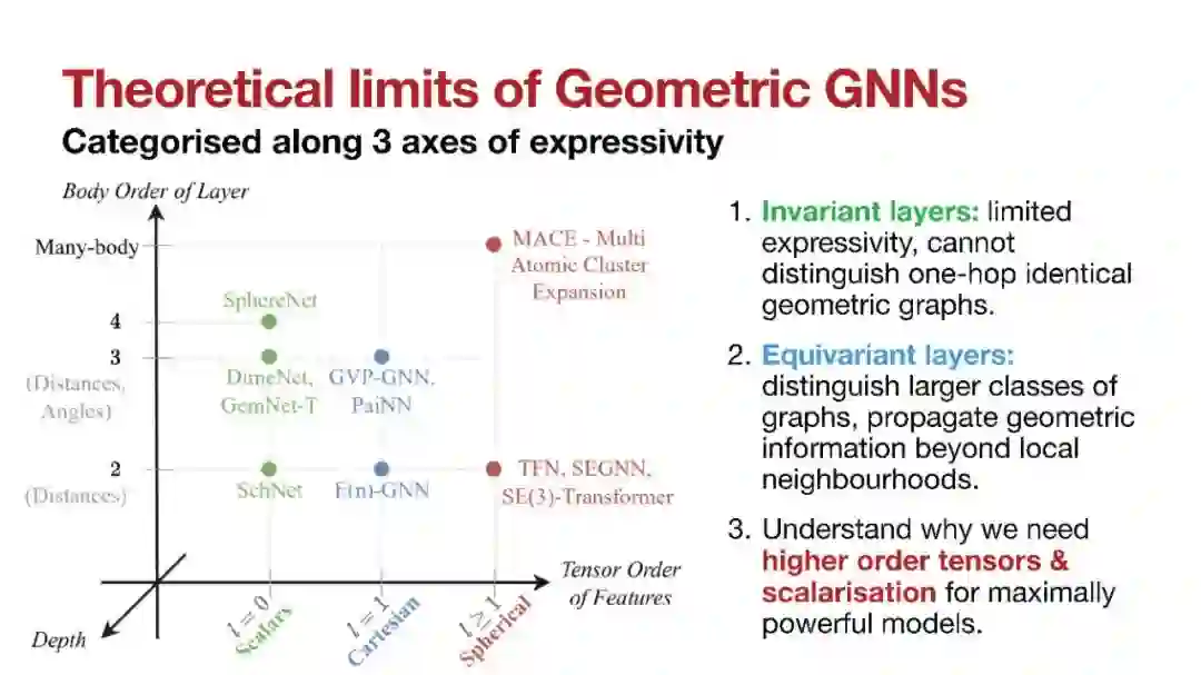 近期在原子系统的计算建模方面取得了重大进展,涵盖了分子、蛋白质和材料,将它们表示为几何图,其中原子作为节点嵌入在三维欧几里得空间中。在这些图中,几何属性根据三维原子系统的固有物理对称性进行变换,包括欧几里得空间中的旋转和平移,以及节点排列。近年来,几何图神经网络已成为支持从蛋白质结构预测到分子模拟和材料生成等应用的首选机器学习架构。它们的特点在于所利用的归纳偏差——例如物理对称性和化学属性——来学习这些几何图的信息表征。在这篇具有见解的论文中,我们提供了一个关于三维原子系统几何GNN领域的全面和自包含的概述。我们覆盖了基础背景材料,并介绍了几何GNN架构的教学分类:(1)不变网络,(2)笛卡尔基础上的等变网络,(3)球形基础上的等变网络,以及(4)不受限制的网络。此外,我们概述了关键数据集和应用领域,并提出了未来的研究方向。这项工作的目标是对该领域提供一个结构化的视角,使新手易于接触,并帮助从业者对其数学抽象概念形成直觉。