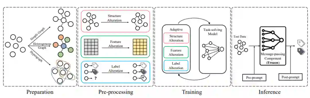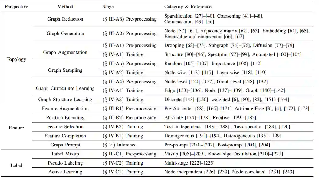 表1:以数据为中心的图学习方法的分类与代表性研究 本综述的其余部分组织如下:第2章概述了以数据为中心的图学习的背景,并描述了图数据是如何手动处理的。第3-5 章分别介绍了在预处理、训练和推断阶段的以数据为中心的图学习方法。第6章介绍了图数据的潜在问题,并讨论了如何处理这些问题。最后,第7章对本文进行了总结,并提出了一些有可能有益于该领域发展的未来研究方向。