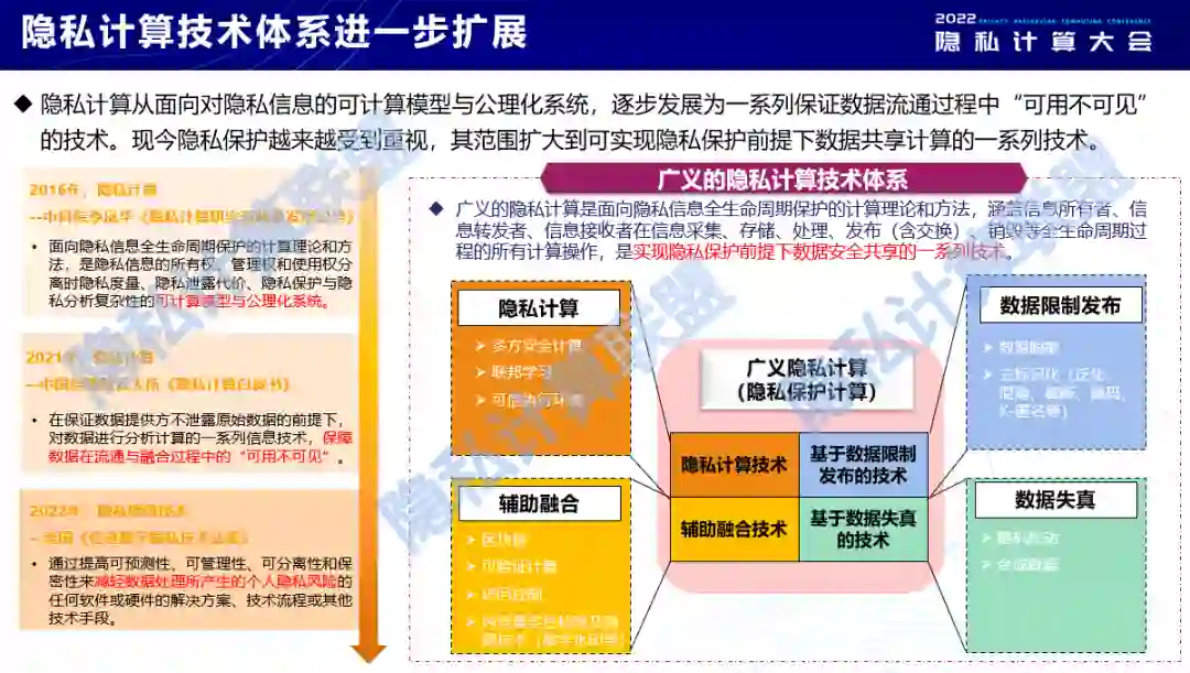 从2016年中科院的李风华等人提出隐私计算相关概念,到隐私计算联盟、中国信通院云大所去年发布的隐私计算白皮书(2021),以及近年来美国等国家纷纷提出隐私增强计算、隐私保护计算等概念,随着隐私计算的深入发展,其概念和理论扩展越来越丰富,越来越深化,也越来越广阔。因此,除了多方安全计算、联邦学习、可信执行环境三大主流方法外,数据限制发布类的、数据失真类的、区块链类的相关技术也应纳入广义隐私计算的范畴,实现隐私保护前提下数据安全共享的一系列技术都在广义隐私计算的范畴内。