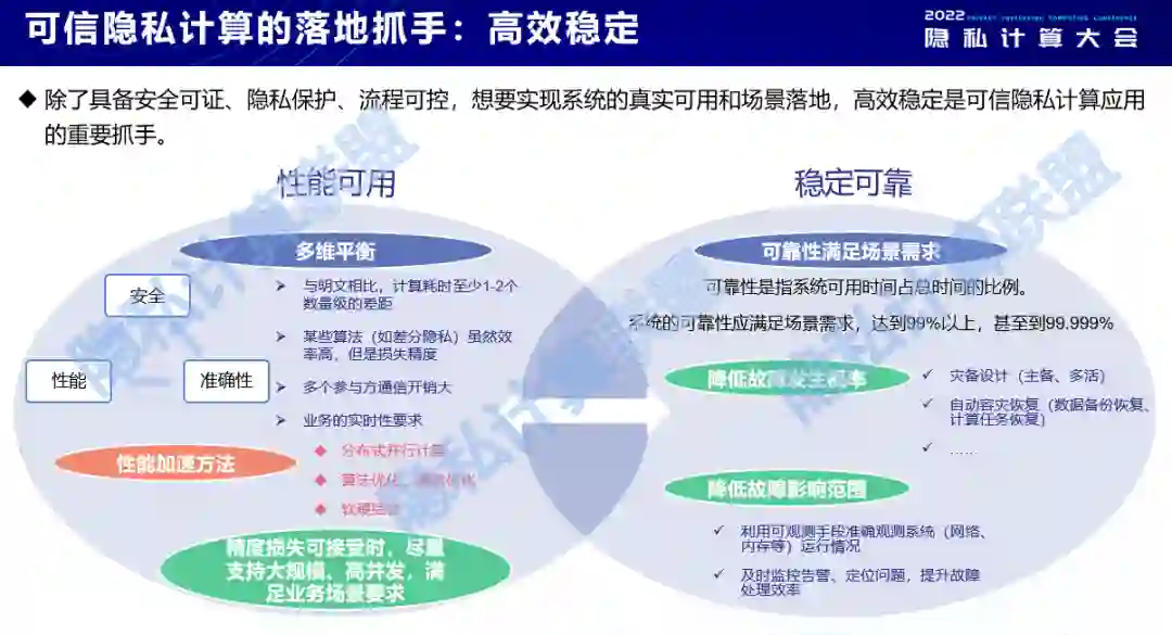 为实现技术的场景可用和规模应用,可信隐私计算的可用性可以用高效稳定来度量。一方面,隐私计算效率的提升必然涉及到安全性和计算精度,需要做到多个维度的平衡,需要在保证数据安全和精度可接受的前提下,尽量支持大规模、高并发的计算量,并满足业务场景的要求。另一方面,未来隐私计算在面向更大规模应用的时候,用户对它的系统稳定性也有很高的要求,应在满足场景需求的前提下,达到99%以上,甚至到99.999%,这也是可信很重要的特征。