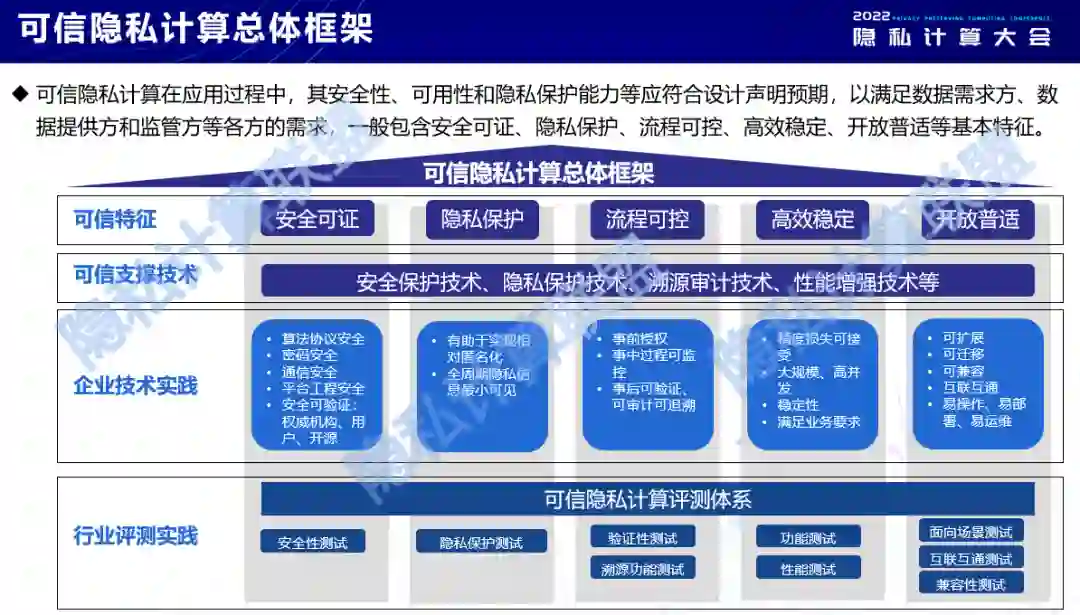 2022年7月13日,由中国通信标准化协会指导,中国信息通信研究院(以下简称中国信通院)、隐私计算联盟主办的2022隐私计算大会在京召开。会上,中国信通院云计算与大数据研究所高级业务主管袁博发布了《可信隐私计算研究报告(2022年)》。