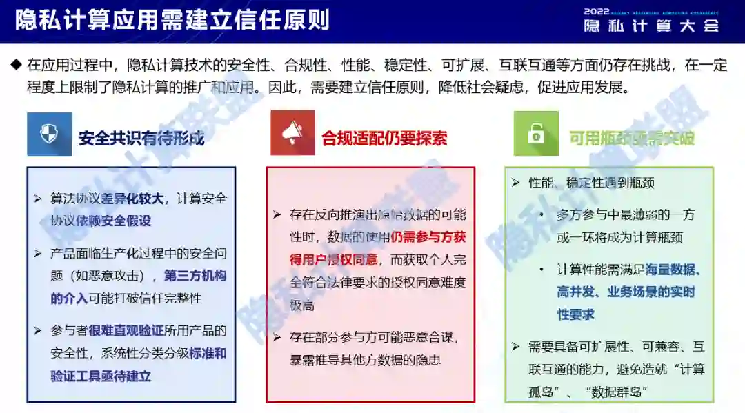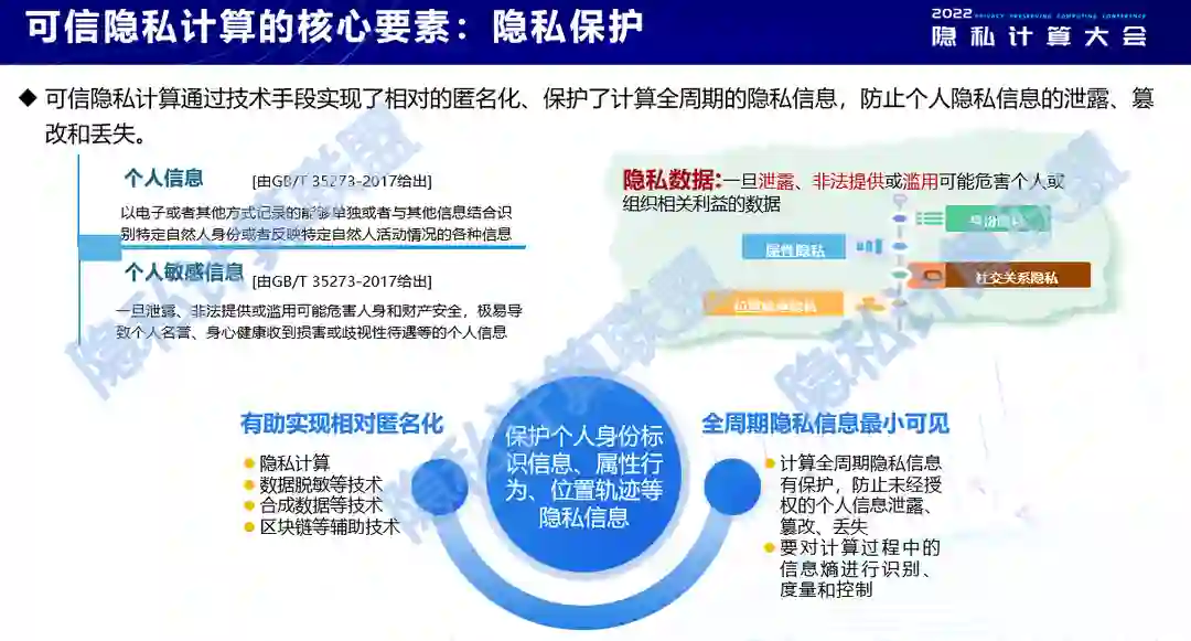 隐私计算需要保护隐私信息。从广义隐私计算来看,它更有助于实现相对的匿名化,比如利用隐私计算技术,数据脱敏技术,合成数据技术或者区块链辅助技术等等,有利于实现相对匿名化,有利于实现技术的合规适配。除此之外,隐私计算还需要对计算全周期的隐私信息进行保护,防止未经授权的个人信息泄露、篡改和丢失,从而促进数据的最小化利用;同时也要对计算过程中的信息熵进行识别、度量和控制。