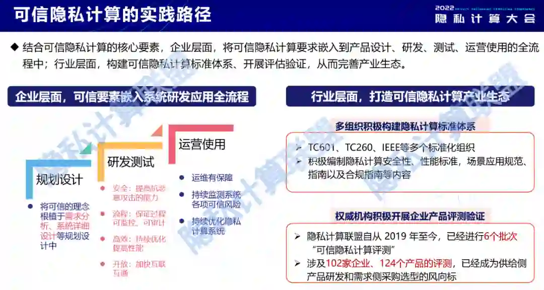 在隐私计算技术的实际应用过程中,我们建议把以上可信特征嵌入其中。在企业层面,规划设计阶段把可信理念植根于需求分析、系统详细设计等阶段,研发测试阶段可以通过各种方法提高可信特征的实现,使用运营阶段要持续监控和优化系统的各项可信风险。在行业层面,标准先行才能更好引领发展。结合可信要素,各个标准化组织通过制定一系列的标准、开展评测去规范当前行业的快速发展,隐私计算联盟也在积极开展企业产品评测工作。