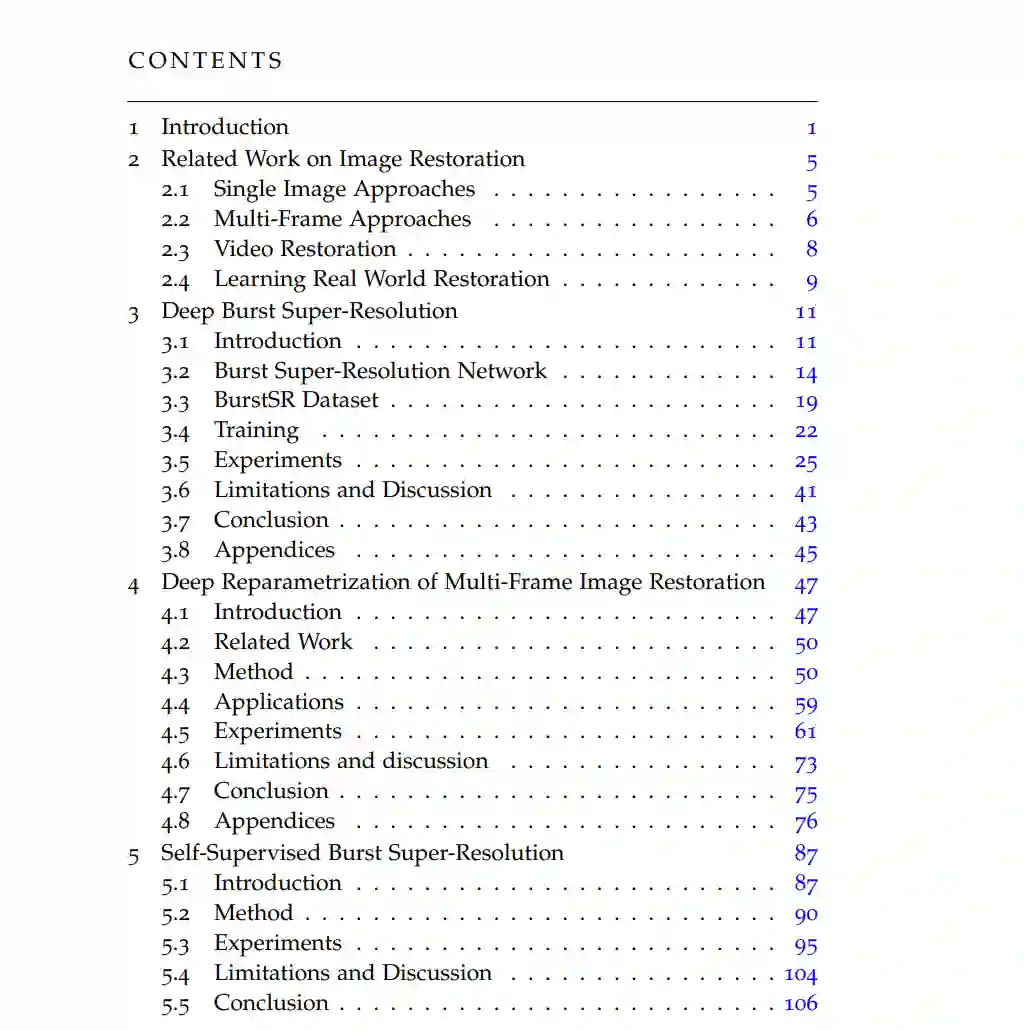 移动相机的兴起已导致摄影学经历了基础性的变革,这归因于它们的低成本、小尺寸以及易用性。然而,对移动相机施加的硬件限制显著降低了它们照片的质量。因此,现代相机依赖软件技术来提高图像质量。一个有前景的方向是结合来自多图像的信息来生成更高质量的图像。在本文中,我们处理这个多帧图像恢复问题。 首先,我们为RAW burst超分辨任务引入一种新颖的架构。我们的网络将多个噪声RAW图像作为输入,并生成一个去噪、去马赛克并超分辨的RGB图像作为输出。为了在现实世界的数据上实现训练和评估,我们还额外收集了第一个burst超分辨数据集,包括智能手机burst和高分辨率DSLR参考。尽管我们的训练对中存在空间和颜色的不对齐,但我们在现实世界的burst上展示了有前景的超分辨表现。