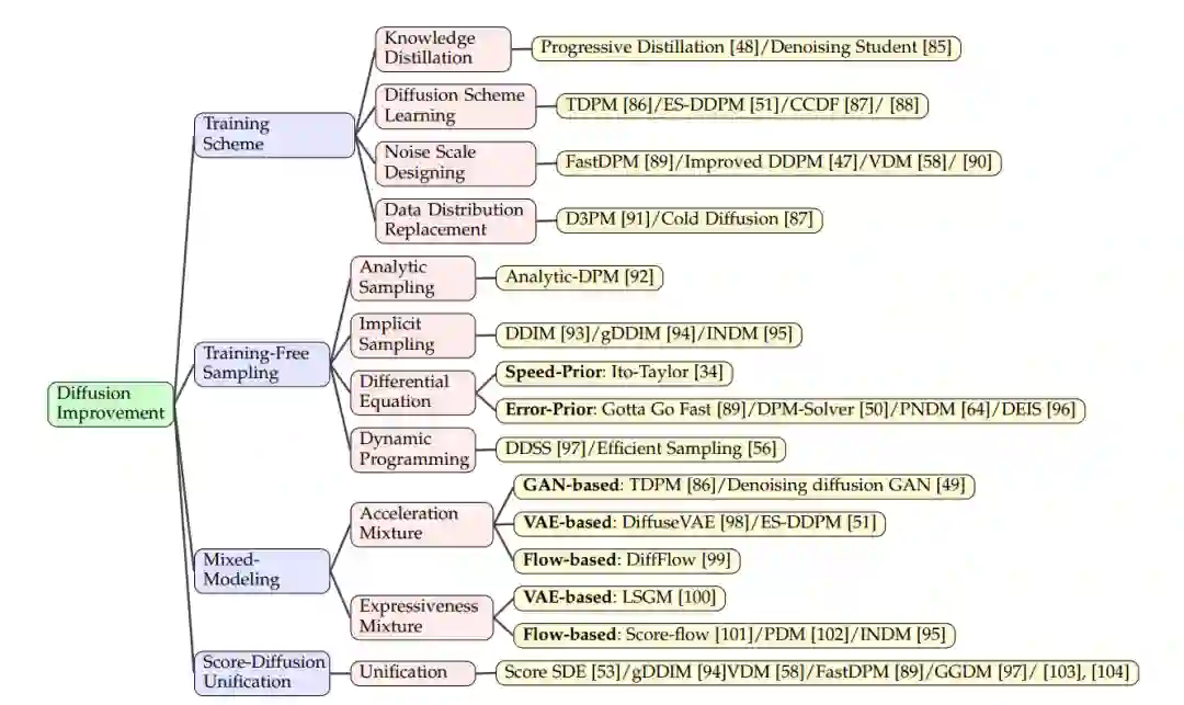本文对改进扩散算法进行了全面和最新的分类,并将其分为五类: 蒸馏、噪声/轨迹学习、高级免训练采样、混合生成建模和评分与扩散统一。