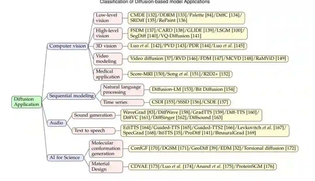 提供关于扩散模型在计算机视觉、自然语言处理、生物信息学和语音处理方面的应用的广泛陈述,包括领域专用问题公式、相关数据集、评估指标、下游任务以及基准集。