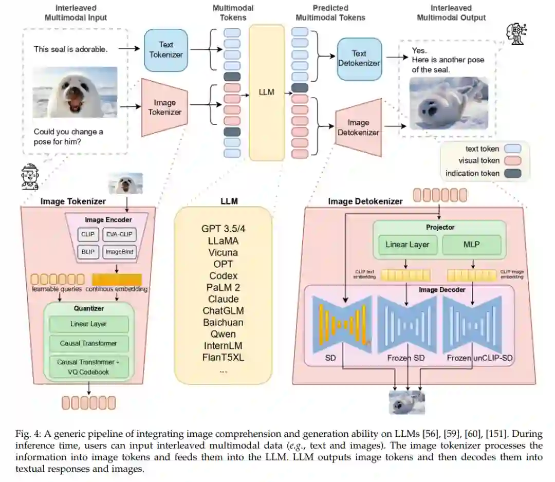 我们首先在第2节回顾了关于特定模态生成和LLMs的相关综述。接着在第3节简要回顾了代表性生成模型、多模态编码器、Transformer和LLMs的基本技术。然后,我们在第4节、第5节、第6节、第7节和第8节分别回顾了基于LLMs的不同视觉模态的视觉生成,包括图像、视频、3D、音频和多模态代理。最后,我们在第9节讨论了生成式AI的安全性,并在第11节探讨了基于LLMs的多模态生成领域的几个潜在未来方向。
