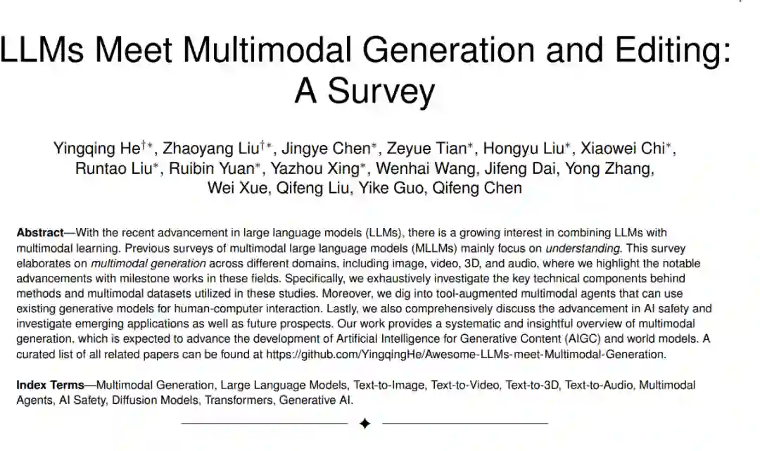 随着大型语言模型(LLMs)的最新进展,结合LLMs与多模态学习的兴趣日益增长。先前关于多模态大型语言模型(MLLMs)的综述主要集中在理解方面。本综述详细阐述了不同领域的多模态生成,包括图像、视频、3D和音频,并重点介绍了这些领域的里程碑式的显著进展。具体来说,我们详尽调查了这些方法背后的关键技术组件和研究中使用的多模态数据集。此外,我们深入探讨了可以利用现有生成模型进行人机交互的工具增强型多模态代理。最后,我们还全面讨论了人工智能安全的进展,并研究了新兴应用及未来前景。我们的工作提供了对多模态生成的系统且深入的概述,预计将推动生成内容人工智能(AIGC)和世界模型的发展。所有相关论文的精选列表可以在https://github.com/YingqingHe/Awesome-LLMs-meet-Multimodal-Generation找到。