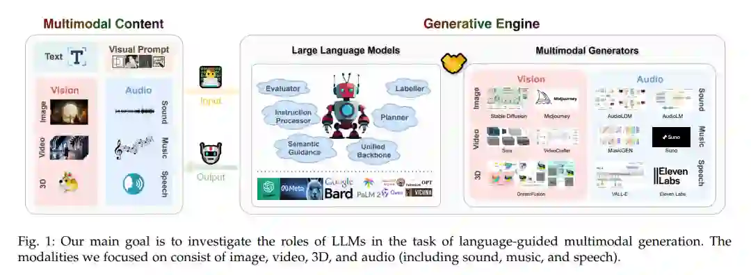 随着大型语言模型(LLMs)的显著进步,其他非文本模态开始利用LLMs的力量来增强其生成流程,或将文本生成与非文本生成集成到一个统一系统中,旨在实现更高级的功能和改进的生成性能。在图像生成方面,有两类方法与语言模型实现了显著的整合。第一类方法涉及将视觉信息编码为离散的令牌ID,试图统一视觉理解与生成 [56]–[61]。具体来说,视觉信息被编码为令牌表示,LLMs直接理解并生成视觉令牌,从而实现视觉理解与生成的同步。第二类方法专注于利用LLMs提升现有预训练文本到图像(T2I)模型的生成质量:一类工作涉及利用LLMs作为布局规划器,结合对象的空间位置、数量和对象大小的知识,生成所需的边界框 [62]–[66]。在获得边界框后,可以通过一个基于文本到图像(T2I)模型生成图像 [67]。另一种方法是利用LLMs扩展用户输入的提示 [68]:通过提供高度详细和全面的用户提示,LLMs通过丰富提示信息生成高质量的图像。在LLMs的帮助下,视觉生成实现了更高的生成质量、改进的提示跟随能力、对话功能和用户友好界面。在视频生成方面,LLMs作为统一的多模态联合生成的通用骨干 [69]、[70],用于视频布局规划 [63]、[71]–[74] 和动态指导的时间提示生成 [75]–[79]。在3D生成和编辑方面,LLMs作为用户与3D资产之间的桥梁,提高了交互效率 [80]、[81] 并帮助用户理解 [82]、[83] 3D资产。在音频生成和编辑方面,语言模型主要作为多模态音频的协调骨干 [84]–[96],用于特定任务的条件器 [97]–[99],用于音频理解的标签器 [100]–[102],以及用于交互生成/编辑的代理 [103]–[108],并作为新方法的灵感来源 [47]、[48]、[53]、[109]–[111]。LLMs在音频领域的日益广泛使用不仅改变了我们与声音和音乐互动的方式,还扩展了AGI与音频技术交叉点的边界。此外,多模态代理将多种模态整合到一个系统中,开发出一个能够理解和生成非文本模态的通用系统。因此,LLMs在生成各种模式的内容中扮演着越来越不可或缺的角色。