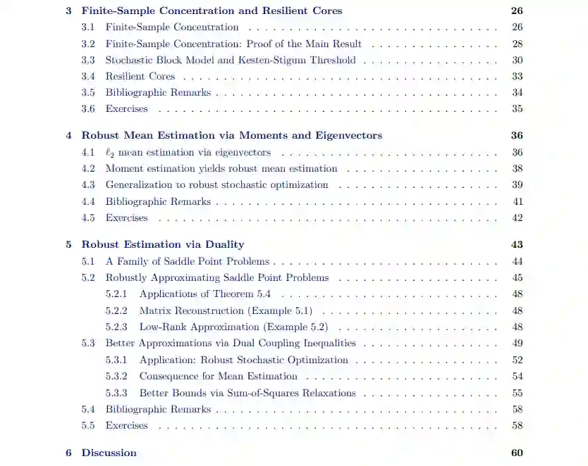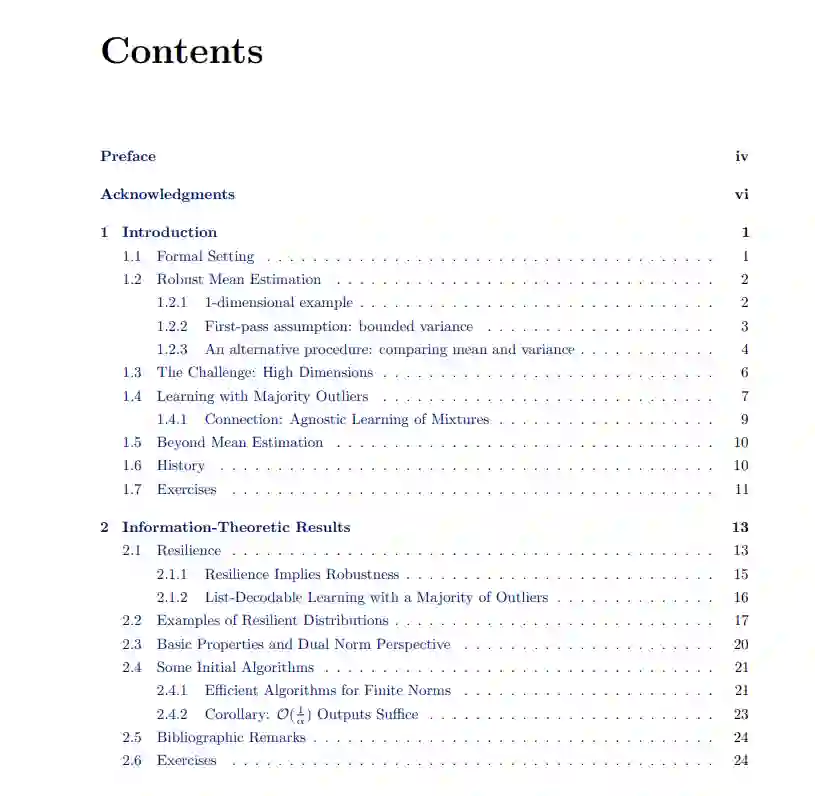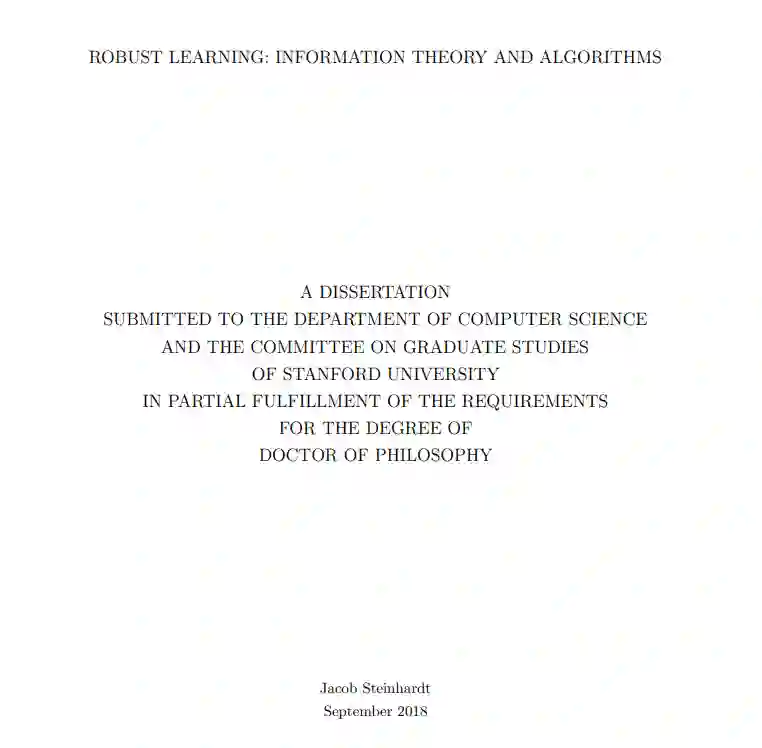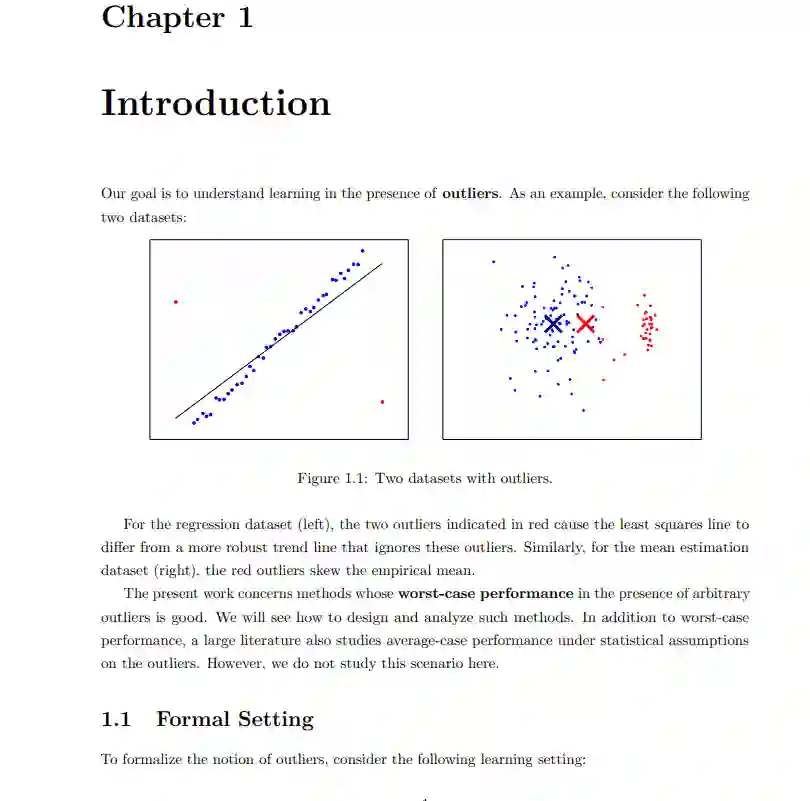 **本文概述了我和我的合作者在鲁棒估计方面的最新成果。关键问题如下:给定一个数据集,其中的一部分由任意离群点组成,我们能从非离群点中了解到什么?**这是一个经典的问题,至少可以追溯到Tukey(1960)。然而,由于种种原因,这个问题最近重新引起了人们的兴趣。首先,许多旧的结果在高维中没有给出有意义的误差边界(例如,在d维中误差通常包含隐式的√d因子)。随着机器学习越来越多地用于高维模型,这需要重新研究。其次,在Charikar等人(2017)中,我们建立了鲁棒估计与其他问题之间的联系,如聚类和随机块模型的学习。目前,聚类高斯混合的最佳已知结果是通过这些鲁棒的估计技术(Diakonikolas等人,2018b;Kothari和Steinhardt, 2018;Hopkins and Li, 2018)。最后,具有结构化异常值的高维生物数据集,如批处理效应(Johnson et al., 2007;Leek等人,2010),以及对机器学习系统的安全担忧(Steinhardt等人,2017),从应用方向促进了对最坏情况异常值的鲁棒性研究。https://cs.stanford.edu/~jsteinhardt/publications/thesis/paper.pdf最近的研究显示,在这些问题上取得了令人鼓舞的进展,但快速的进展导致了文献的不透明。大多数论文单独来看是复杂的,但实际上是由几个关键主题的变化组成的。这篇论文的目的是提供一个易于理解的介绍,以突出主要技术的领域。在第一章中,我们介绍了鲁棒估计的基本问题,给出了在一维情况下的算法,为我们以后在高维情况下的算法做了铺垫,并解释了高维设置的基本难点。在第2章和第3章中,我们关注信息理论的鲁棒性——什么时候有可能(忽略计算成本)在异常值存在的情况下恢复良好的参数估计?这里的情况简单得令人愉快,它基于一种称为弹性的属性,该属性度量点的小亚种群的影响。有趣的是,弹性允许我们恢复对均值的估计,即使大多数点都是异常值,假设我们允许输出多次猜测(所谓的列表可解码设置,最早由Balcan等人(2008)引入)。这一基本事实是鲁棒学习和聚类之间联系的基础,因为我们可以将每个单独的簇视为“好”点的总体,然后将其余簇中的点视为异常值。在第4章中,我们将注意力转向计算效率算法。假设好的点有有限的协方差,我们可以恢复平均值的估计,误差只随着协方差矩阵的最大特征值增长(通常与维数无关)。其基本思想是,均值偏移超过一小部分的离群点,必然会在数据中产生大的变化方向,这可以通过经验协方差的特征分解来检测。我们展示了如何将这种均值估计结果推广到一般的m估计,只要损失函数的梯度具有有界协方差。最后,在第五章中,我们介绍了一种基于对偶性的替代计算方法。使用这种方法,我们可以找到一个大家族鞍点问题的近似最小化存在离群点。这允许我们恢复与第4章相似的平均估计结果,优点是即使大多数点是异常值,结果也保持不变。这将生成目前给出最佳已知边界的聚类算法。然而,第4章和第5章中的技术都在积极开发中。即使在明年,这两种技术都可能获得更强的效果。总之,我们将看到一个相对完整的关于鲁棒性的信息论视角,以及设计高效算法的两种方法。这些方法以一般的方式呈现,以至于该领域的许多关键结果都是简单的推论,通常只需要大约一页的代数来检查条件。我们希望通过揭示争论背后的结构,我们将使新的研究人员能够应用和扩展这些结果。