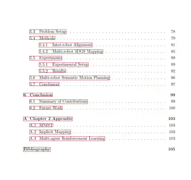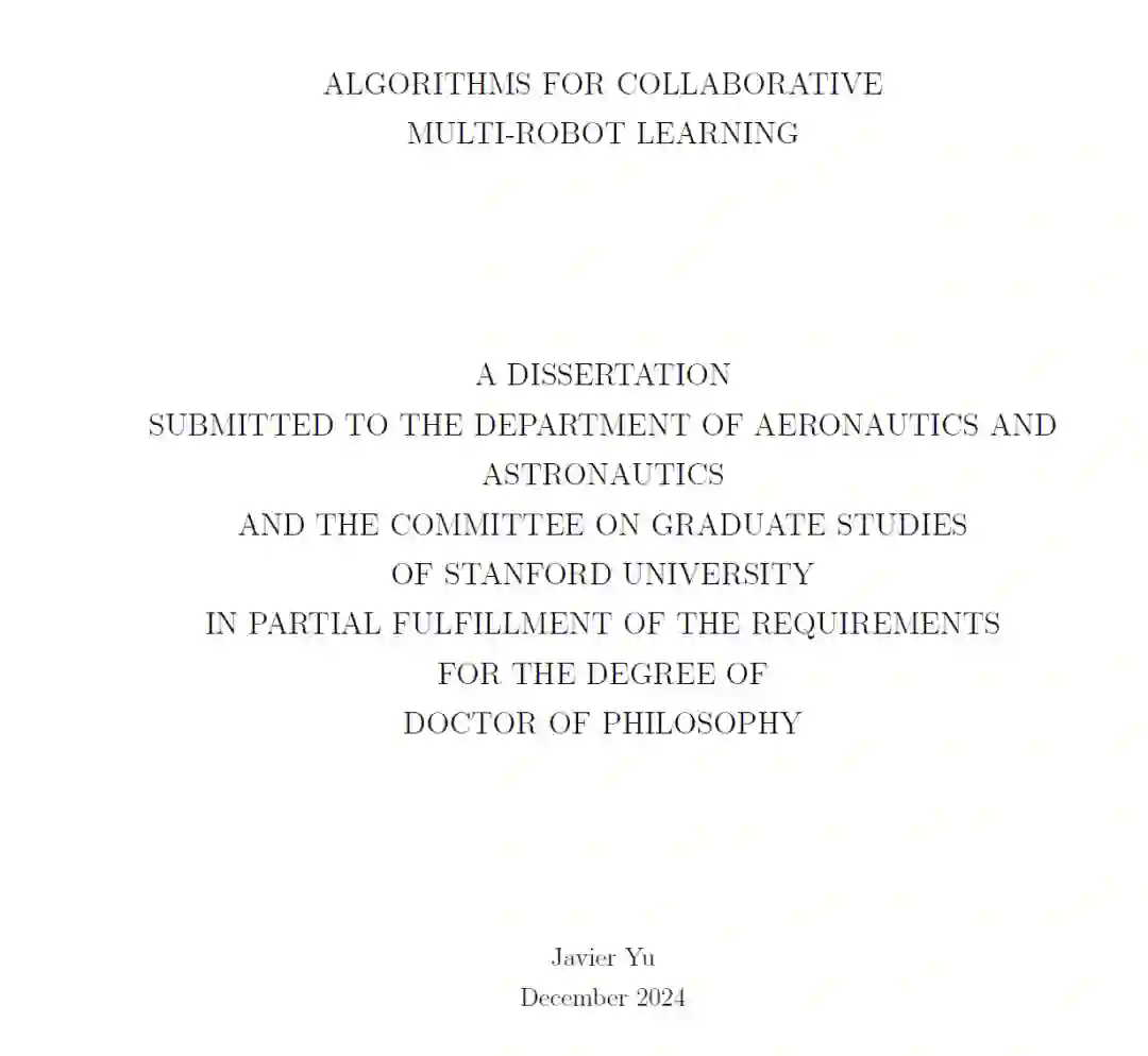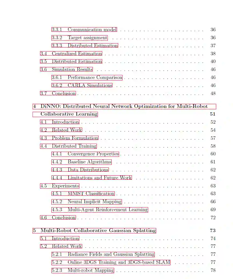 为了使机器人系统能够在真实世界中常常令人惊讶且不可预测的环境中成功运行,它们必须具备在部署期间学习和适应的能力。然而,在机器人领域,通常将每个机器人视为一个单独的孤立系统,必须独立学习新技能并对环境作出反应。实际上,世界早已是一个高度互联的环境,数以亿计的独立设备持续进行通信。因此,没有理由机器人系统不能遵循相同的模式。事实上,由于数据获取通常是有效且高效学习的瓶颈,多机器人系统可以通过协作共享多个机器人收集的数据,实现学习速度的倍增效应。 本论文提出了三种用于互联多机器人系统协作学习的新型算法,以及支持并验证它们在真实世界中部署的工具与分析方法。 第一个算法在本论文的第三章中介绍,是一种新颖的自主车队对数百个目标车辆进行同时跟踪的方法。通过利用多个自动驾驶车辆的实时数据,该算法使车队能够形成对所跟踪目标车辆运动的城市级感知。每辆车队中的车辆随后都能够利用这种感知,即使在没有直接视线的情况下,也能预测被跟踪车辆的未来运动,从而避免诸如盲角等危险情况。我们通过在真实的自动驾驶车辆仿真环境中进行城市级分布式多目标跟踪演示了该方法的潜力。 第四章介绍了本论文的第二个算法贡献,一种使互联机器人能够利用各自独立收集的数据,以通信高效的方式协作优化神经网络参数的方法。该算法可推广至任何神经网络架构,且从不需要传输原始数据,从而保证了通信效率。为了验证我们的观点,我们展示了该方法在三个不同的应用场景下优于基线方法:分类、神经隐式映射和强化学习。 最后,在第五章中,我们讨论了本论文的最后一个贡献,一种多机器人度量-语义映射算法,使多种不同的机器人系统能够异步且协作地学习高度详细的环境地图。在实验演示中,我们展示了该方法在多个不同环境中的有效性,并证明了生成的地图可用于多机器人无碰撞运动规划,同时支持开放词汇的语义目标指定。