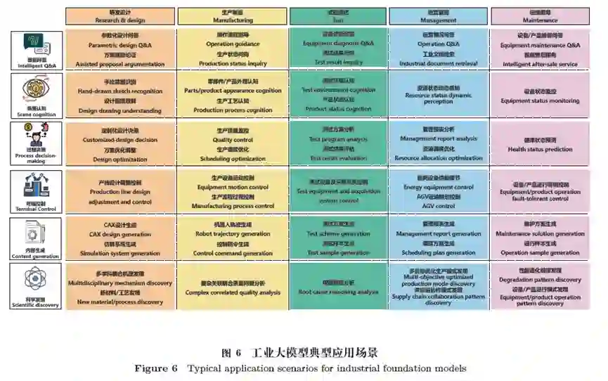 应用场景与通用大模型不同,工业大模型面向工业应用的需求,在其独特的架构和训练方法的支持下,形成6种核心应用能力,包括智能问答、场景认知、过程决策、终端控制、内容生成和科学发现。工业大模型贯穿产品全生命周期、围绕六项核心应用能力的典型应用场景。工业大模型在实际工业生产流程中可以将工业智能体作为载体之一,与工业场景中所涉及的人员与工业赛博物理系统进行交互完成特定任务。