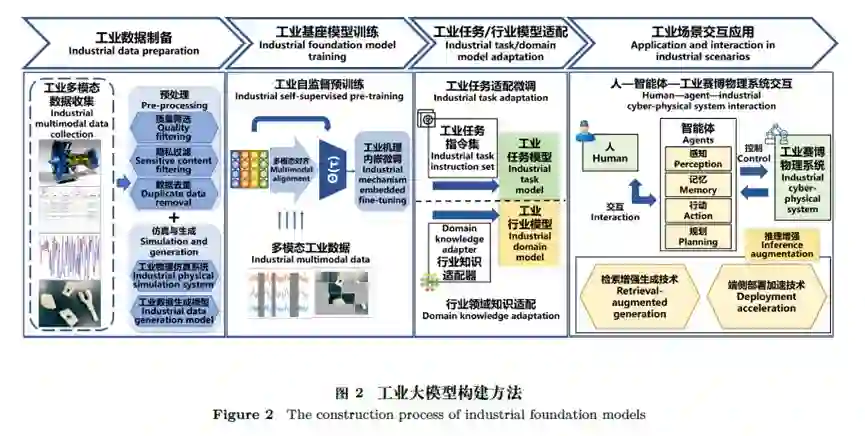 构建方法工业大模型的构建主要包括以下4个阶段:工业数据制备,工业基座模型训练,工业任务/行业模型适配,工业场景交互应用,如图2所示。
