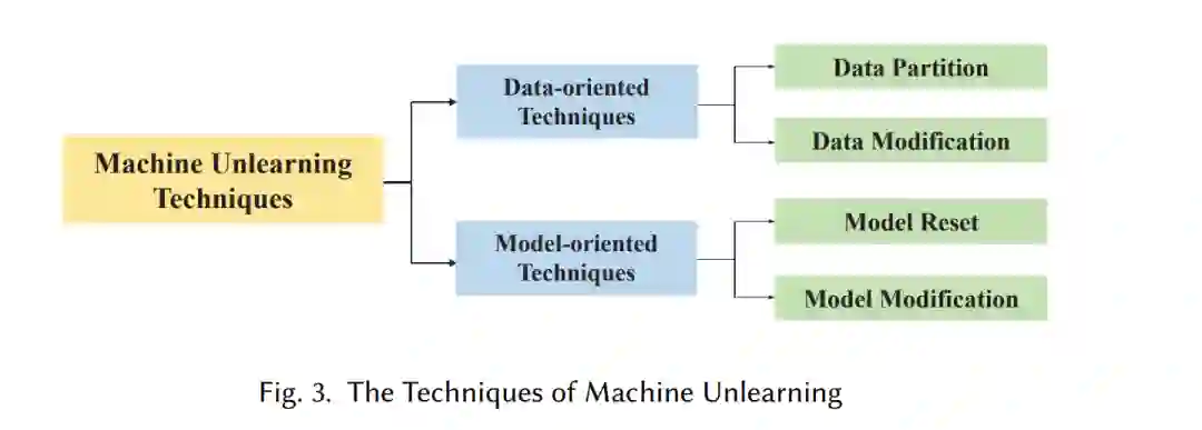 基于修正目标,我们将机器遗忘方法分为面向数据和面向模型的技术。前者是指操作训练集的遗忘方法,包括数据划分和数据修改;而后者是指修改原始模型的遗忘方法,包括模型重置和模型修改。图3总结了机器遗忘技术的分类。