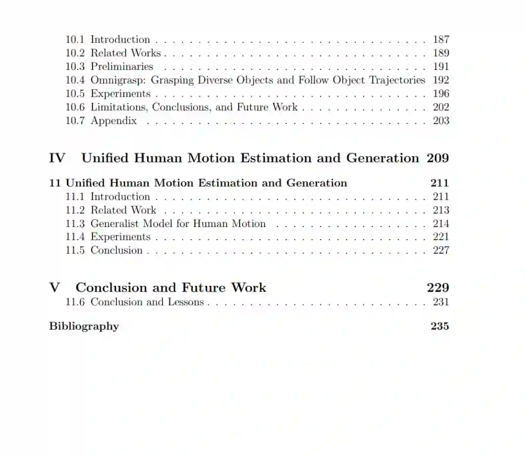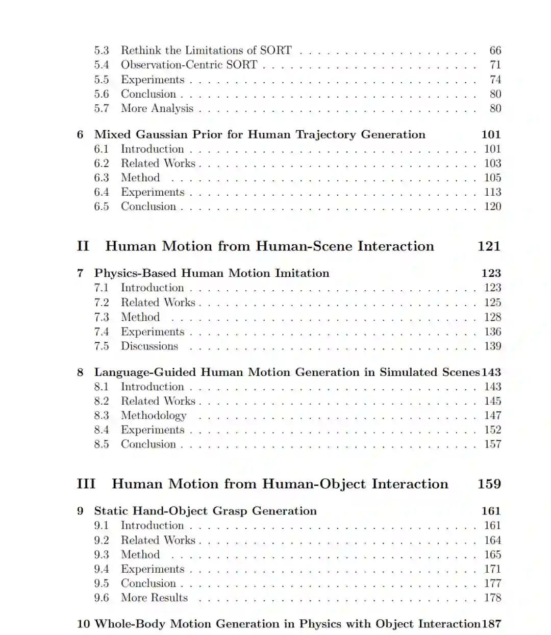 对人类动作进行建模是计算机视觉与机器人学中的一个基础课题。人类与三维物理世界以复杂的方式交互,既涉及位置的变化(全局动作),也包括身体的形变与关节活动(局部动作)。本论文探讨了人与他人、环境以及可操控物体之间的交互过程中的人体动作问题,重点关注人体动作的估计与生成,并强调整合多样化的知识源,如视频、动作捕捉数据和物理仿真。