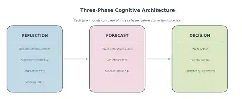 首先,三阶段认知架构迫使模型在承诺行动之前阐明情境评估和对手预测。这种结构化方法创造了前所未有的战略推理记录,并能够分析所阐述的理由是实际影响了决策,还是仅仅伴随着决策。