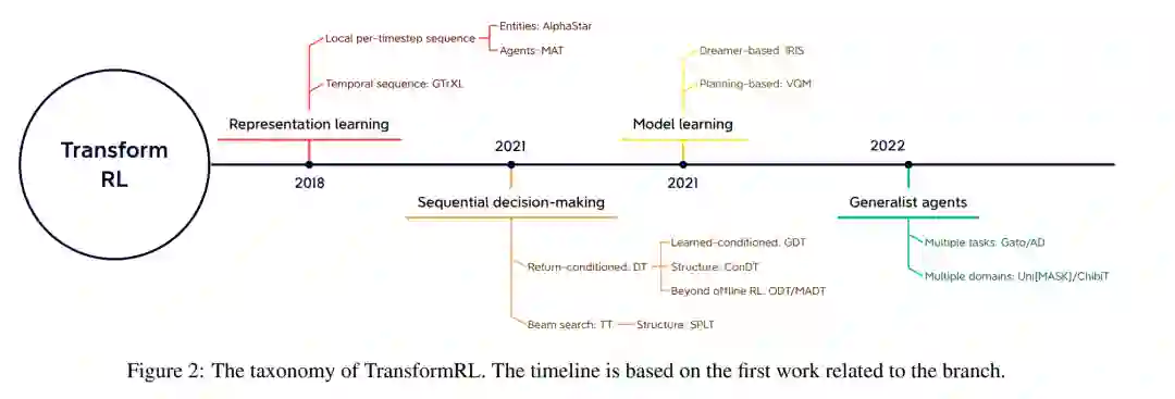 尽管Transformer已经成为大多数监督学习研究的基础模型,但由于上述挑战,它并没有长期在强化学习社区中广泛使用。实际上,大多数TransformRL的早期尝试将transformer应用于状态表示学习或提供记忆信息,同时仍将标准的强化学习算法应用于智能体学习,如时间差异学习和策略优化。因此,尽管引入transformer作为函数逼近器,但这些方法仍然受到传统强化学习框架的挑战。直到最近,离线强化学习才使得从大规模离线数据中学习最优策略成为可能。受离线强化学习的启发,最近的工作进一步将强化学习问题视为固定经验上的条件序列建模问题。通过这样做,它有助于绕过传统强化学习中bootstrapping error的挑战,从而使Transformer架构释放出强大的顺序建模能力。回顾了TransformRL的进展,并提供了一个分类法来介绍当前的方法。将现有方法分为四类:表示学习、模型学习、顺序决策和综合智能体。图2提供了一个分类法草图,其中包含相应作品的子集。