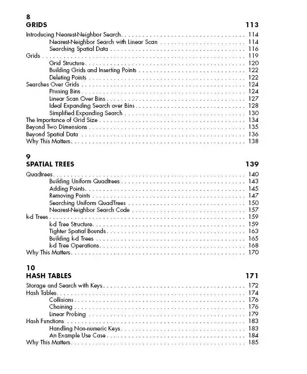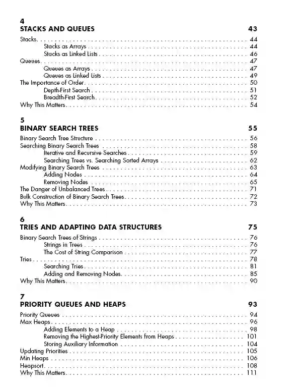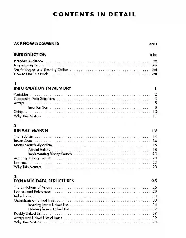 这本书集中在一些规范的数据结构,并使用它们来探索计算思维的基本主题。这些数据结构中的每一个都是更一般的数据结构和概念方法的有用示例。例如,B-树展示了保持搜索树平衡和优化昂贵内存访问的一种方法。我讨论内存使用和布隆过滤器的准确性之间的权衡;跳跃表随机化的使用;以及如何用网格、四叉树或K-D树来捕获多维结构。因此,这本书既不是编程的入门,也不是数据结构的综合选集,也不是煮咖啡的全面分析(尽管我们将反复触及这个重要的话题)。我们的目标是不同的——开发可以应用于一系列特定问题和编程语言的思维工具。