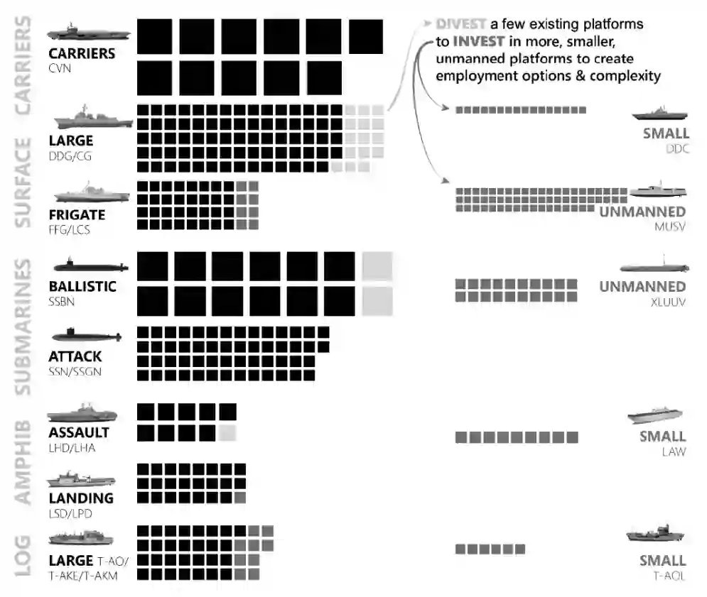 美军已经采用了马赛克兵力设计的许多要素。为了增加可选性,"马赛克"兵力设计将用更多较小的、成本较低的、多功能性较差的单元和系统来取代美军的一部分单一的、独立的平台和单元。尽管这些较小的单元可能在耐力、自我保护或能力方面不如今天的部队要素,但它们可以由多任务平台部署或护送进入战区,并在战斗中被认为是可消耗的或能消耗的。图1显示了如何在美国海军的兵力结构中实施马赛克设计方法,在不增加采购或维持成本的情况下增加舰艇的总体数量。海军和其他美国军种已经在朝着符合马赛克式兵力设计的更加分散的兵力结构方向发展。