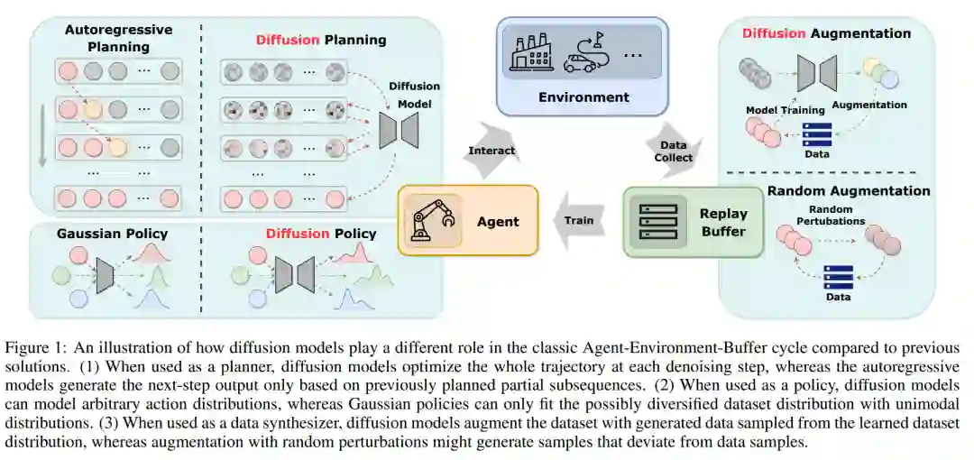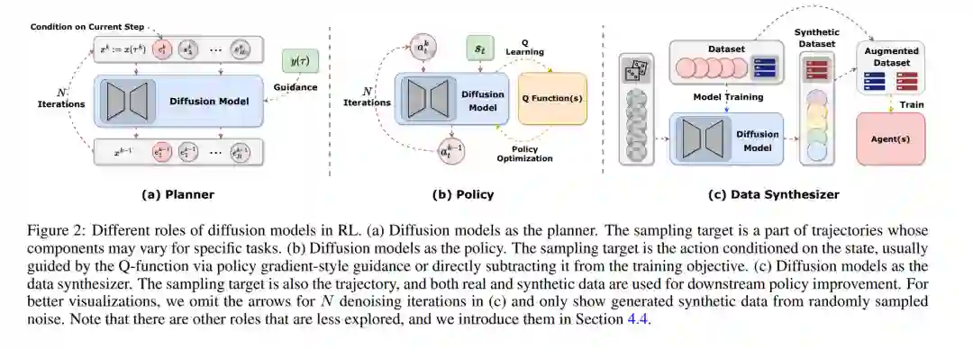 扩散模型已证明了其生成多样化数据和建模多模态分布的能力。考虑到第2节中介绍的长期存在的挑战,使用扩散模型改善RL算法的性能和样本效率是足够的。在图1中,我们说明了扩散模型在RL中与以前的解决方案相比扮演的不同角色。当前应用扩散模型于RL的工作主要分为四个类别:使用扩散模型作为规划器,作为策略,用于数据增强,以及在潜在表示上。以下小节将为每个类别说明整体框架和代表性的论文。