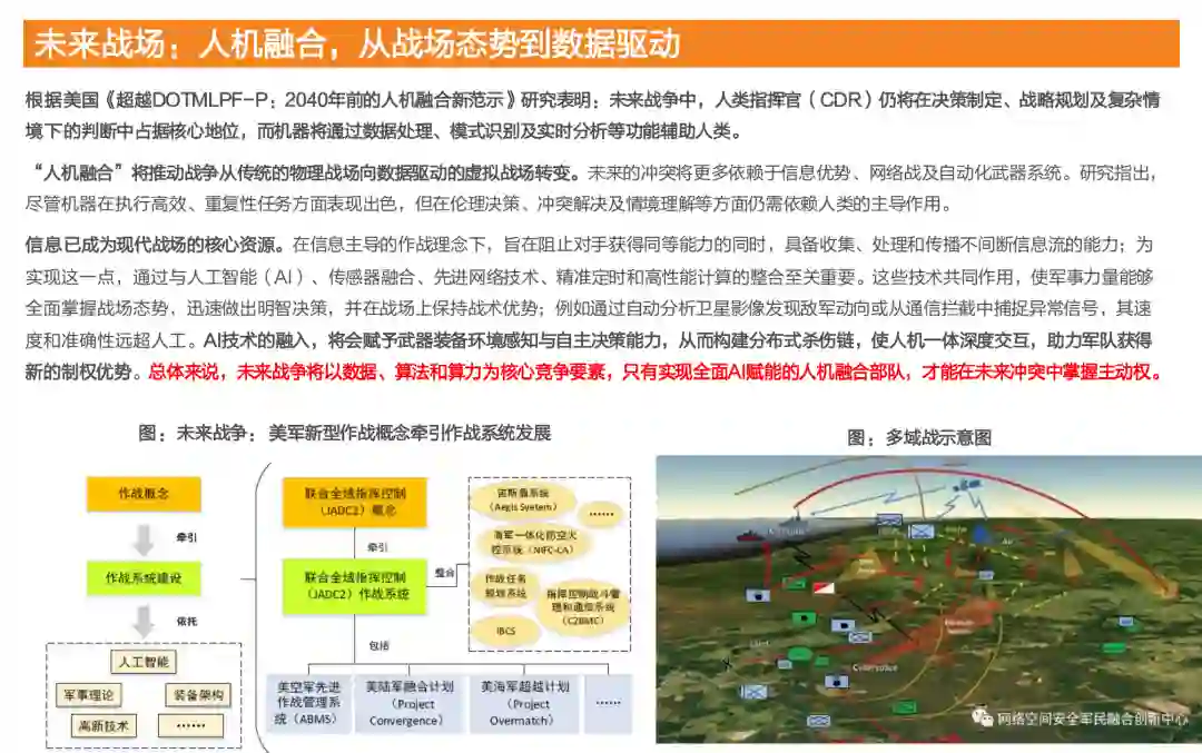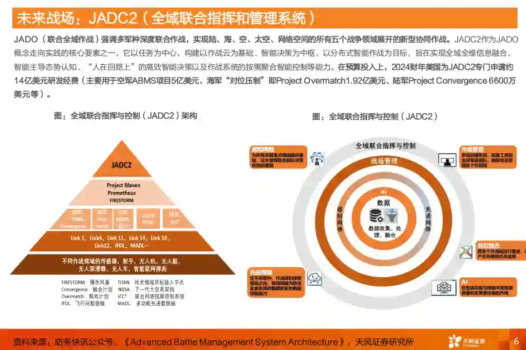 未来战争将以数据、算法和算力为核心竞争要素,只有实现全面AI赋能的人机融合部队,才能在未来冲突中掌握主动权。JADO强调多军种深度联合作战,实现陆、海、空、天、网、电等全域的跨域融合;JADC2作为JADO概念走向实践的核心要素之一,在预算投入上,2024财年美国为JADC2专门申请约14亿美元研发经费。 未来战场无人化势在必行,无人化作战主要可分为侦察、袭扰、定点打击、饱和攻击和支援增效,现代战争已经迈入以无人机、地面机器人为代表作战核心的时代。全球军用无人机市场正处于高速增长阶段,根据FORTUNE Business Inights预测,预计到2032年,市场规模将超过500亿美元,2024-2032年均复合增长率达到13.15%,这一增长得益于AI赋能无人机技术的飞速发展,自主作战能力显著提升成为核心驱动力。 AI与无人技术的深度结合正在引领现代战争的变革,不仅在俄乌冲突中展现了较大潜力,也得益于全球多家AI军工领先 企业的共同推动。以Palantir、Anduril Industry、Scale AI、Shield AI为代表的军工国防科创企业,正通过各自的创新产 品和技术为无人机领域注入新的活力;其中Palantir和Anduril正在与SpaceX、OpenAI、Saronic以及Scale AI等核心竞 争对手进行密切洽谈,计划2025年组建面向传统军火商的创新商业联合体(LMT、波音和雷神等),以争夺美国高达8500亿美元年度国防预算中的更大份额。 以NVIDIA、高通、AMD等领先厂商为代表的军用边缘AI主控芯片供应商,凭借军规级可靠性与丰富的传感器接口,正加速驱动无人装备等平台的前沿智能化与自主化升级。我们认为,国产边缘AI主控芯片以瑞芯微等为代表的企业正加速切入军用无人平台的边缘算力市场,具备潜力市场空间。