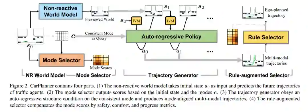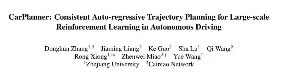 轨迹规划对于自动驾驶至关重要,确保在复杂环境中实现安全高效的导航。尽管最近基于学习的方法,特别是强化学习(RL),在特定场景中展现了潜力,但RL规划器在训练效率和处理大规模现实驾驶场景方面仍面临挑战。在本文中,我们提出了CarPlanner,一种基于一致性的自回归规划器,利用RL生成多模态轨迹。自回归结构实现了高效的大规模RL训练,而一致性的引入通过保持时间步之间的一致性,确保了稳定的策略学习。此外,CarPlanner采用了一种生成-选择框架,结合专家引导的奖励函数和不变视角模块,简化了RL训练并提升了策略性能。大量分析表明,我们提出的RL框架有效解决了训练效率和性能提升的挑战,使CarPlanner成为自动驾驶轨迹规划的有前景的解决方案。据我们所知,我们是首个证明基于RL的规划器能够在具有挑战性的大规模现实数据集nuPlan上超越基于模仿学习(IL)和基于规则的最先进方法(SOTAs)的研究。我们提出的CarPlanner在这一高要求数据集中超越了基于RL、IL和规则的SOTA方法。