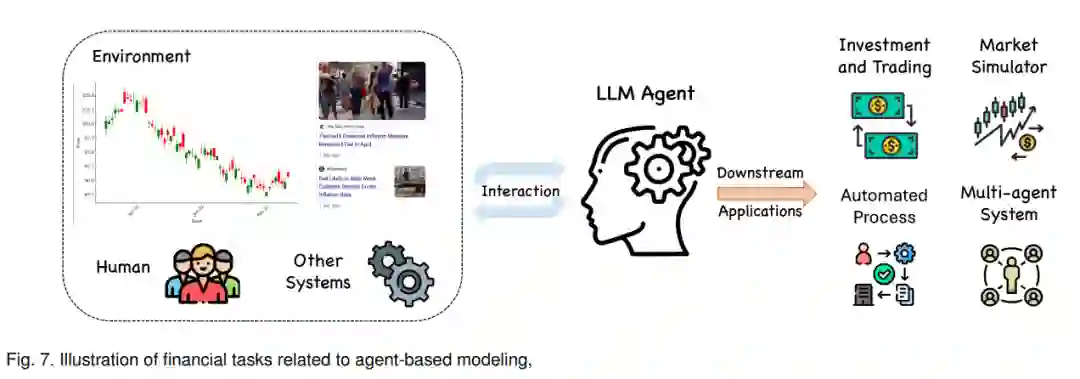 传统上,ABM在金融中的应用侧重于模拟不同类型市场参与者之间的互动,如机构投资者、个人交易者和监管机构[260]。这些模型被用于研究监管变更、市场冲击和行为偏差对市场动态的影响。例如,基于代理的模型已被用来模拟高频交易的影响、金融危机的传播以及资产泡沫的形成。将LLMs加入这些模型进一步增强了其预测能力和准确性,使代理能够以类似于人类分析师的方式处理和响应实时信息。 在本节中,我们探讨了LLMs与基于代理的建模在各种背景下的整合。我们讨论了基于LLM的交易和投资代理如何增强决策和策略制定。我们还研究了LLMs在模拟市场和经济活动中的应用,强调它们对政策分析和市场预测的影响。此外,我们回顾了多代理系统在改进金融过程自动化和监控中的作用,强调这些先进模型在金融分析和策略开发中的革命性潜力。