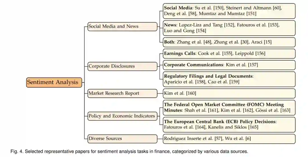 情感分析在自然语言处理(NLP)领域中成为一个关键组成部分,也是金融应用中最重要的任务之一。它涉及对文本数据中表达的意见、情感、主观性和情绪的定量探索[134],[135]。在金融应用中,这一任务尤为重要,因为市场情绪的解释可以导致具有重大影响的预测和行动[136]。其演变反映了NLP的广泛进步,从基于规则的系统过渡到复杂的机器学习模型,最近又转向利用大规模预训练语言模型的深度学习方法。