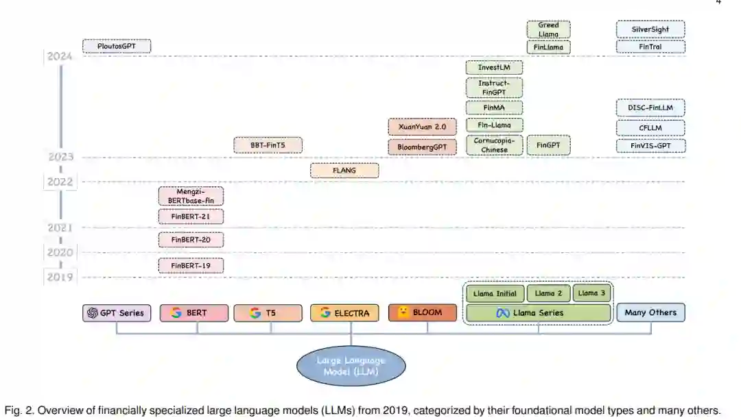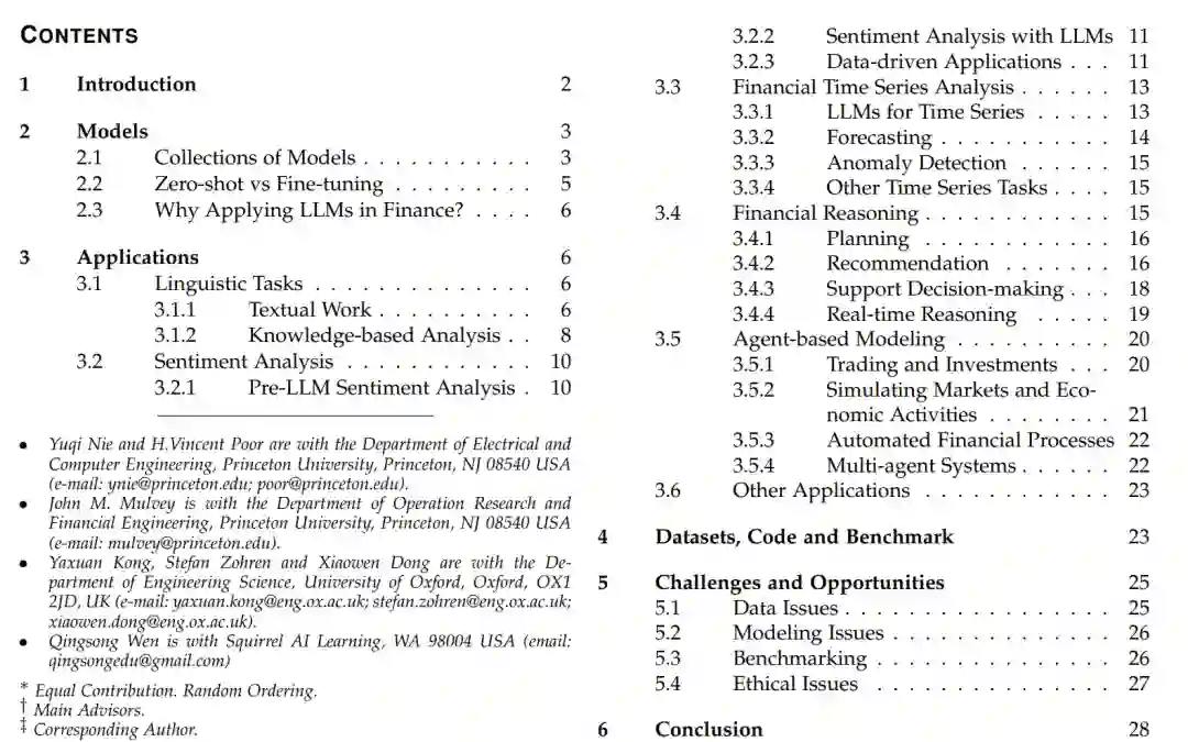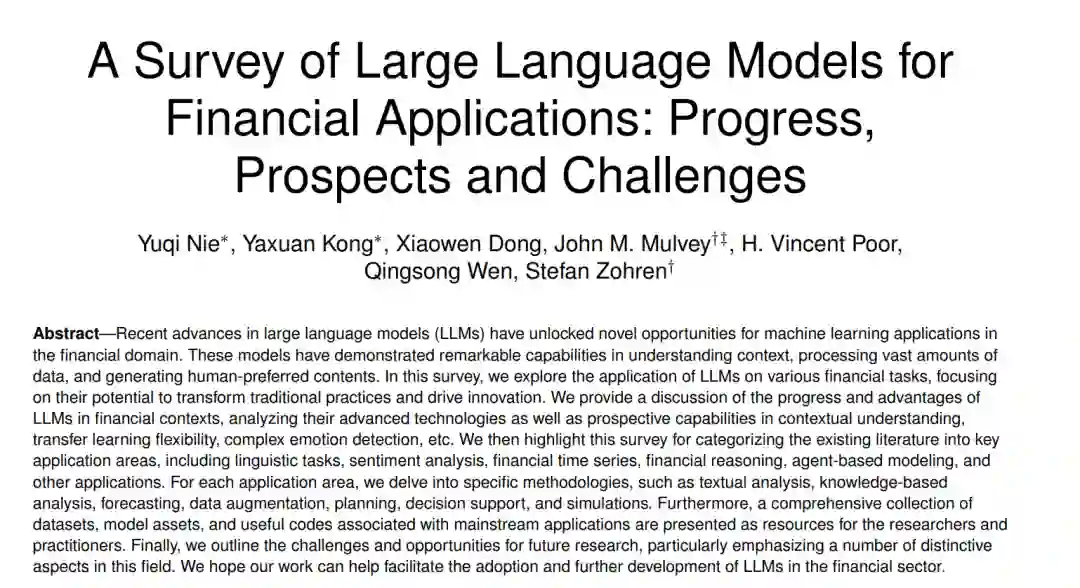 近年来,金融领域对LLMs在各种应用中的应用表现出日益浓厚的兴趣。这些应用不仅正在重塑金融分析的格局,还为市场行为和经济活动提供了新的视角。例如,在语言任务中,LLMs在总结和提取广泛金融文档中的关键信息方面表现出色,从而将复杂的金融叙事简化为简明的摘要,使信息处理更加高效。情感分析作为金融中最关键的应用之一,已被广泛研究了数十年。LLMs的进步使其在从金融新闻、社交媒体和公司披露中量化市场情绪方面变得至关重要,从而提供影响市场波动和投资决策的关键见解。此外,LLMs在金融时间序列分析中显示出潜在能力,包括预测市场趋势、检测异常和分类金融数据,尽管其有效性仍存在争议。这些模型旨在通过利用其深度学习架构来捕捉金融数据集中复杂的时间依赖性和模式,从而增强预测准确性和鲁棒性。LLMs在超越以前深度学习方法的研究领域中最有前景的方面之一是其推理能力,这使其不仅能拟合数据,还能模仿类似人类认知的推理过程。在金融推理中,LLMs支持金融规划,生成投资建议,并通过处理和综合来自不同来源的大量金融数据来协助决策。利用其模仿人类决策过程的能力,LLMs还被应用于基于代理的建模。这一应用将LLMs的推理能力扩展到代理与其环境、市场和人类之间的互动,从而能够模拟市场行为、经济活动和金融生态系统的动态。
