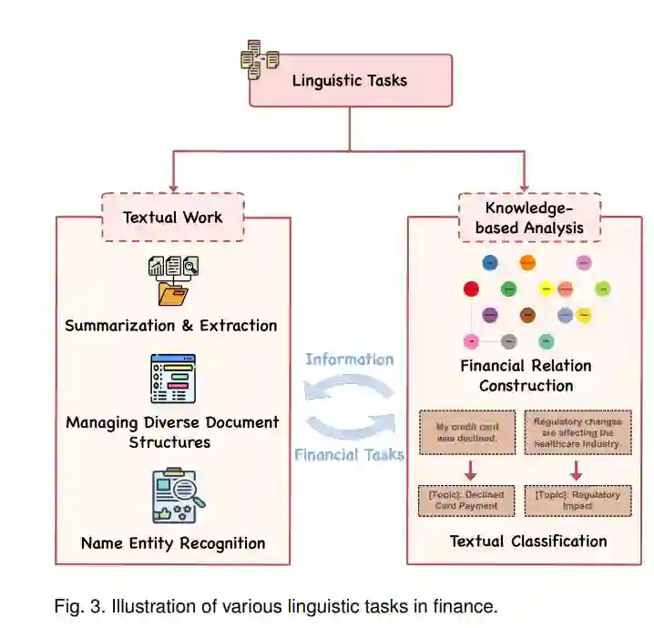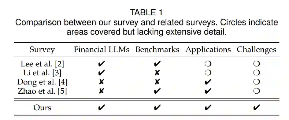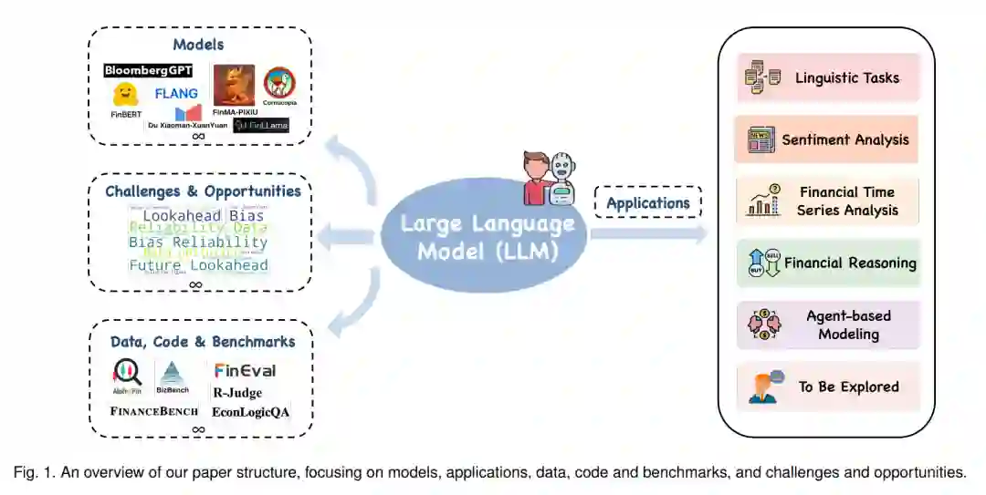 尽管这些贡献显著,现有的综述通常缺乏对金融特定的实际挑战和机遇的深入探讨,或主要关注技术方面而未涉及对金融决策和行业实践的广泛影响。本综述旨在填补这些空白,不仅回顾最先进的技术,还提供对专用模型、有用基准、创新应用和基本挑战的详细分析。我们的工作通过提供一个由金融实际应用驱动的全景视图,为研究人员和从业者提供了宝贵的见解。