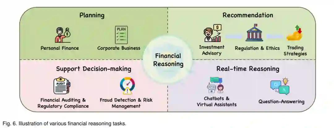LLMs在金融推理中的应用提供了几个关键优势。首先,它们可以通过处理大量金融信息,识别帮助做出更好决策的模式和趋势,从而增强数据分析。其次,LLMs可以用于预测建模,使其能够预测市场状况和资产表现,从而提出稳健的投资建议。此外,LLMs还可以提供个性化的咨询服务。它们可以分析个人或组织的财务状况、目标和风险承受能力,以提供定制化的建议。另一个好处是实时监控和警报,LLMs可以监控金融市场趋势和新闻,提供及时的更新和警报,帮助用户根据需要调整策略。此外,LLMs还可以提高可访问性和参与度。通过将这些模型集成到用户友好的界面如聊天机器人中,金融规划和咨询变得更加可访问和有吸引力,使个人能够更好地掌控自己的财务健康。