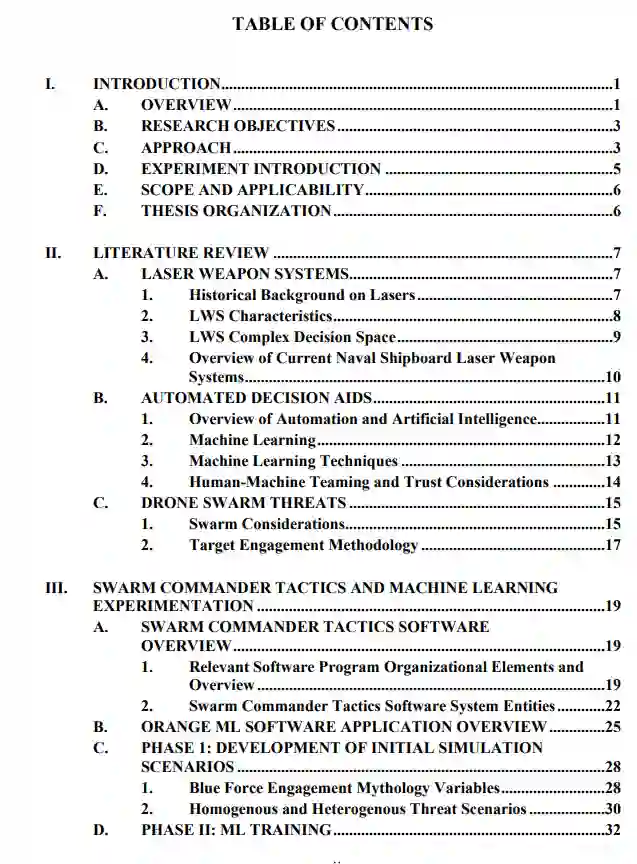 这篇论文研究了威胁交战方法,确定了有效操作激光武器系统必须考虑的决策因素,以及人工智能和机器学习在支持决策方面的应用。对无人驾驶飞行器或无人机的威胁进行了基础研究,以确定风险并支持交战方法的发展。该基础研究支持选择场景并将其编入兵棋和仿真软件Swarm Commander Tactics,该软件用于模拟战斗。这项研究进行了一项实验,通过建模和仿真交战场景来开发机器学习算法的概念验证,以收集训练数据并使用这些数据来训练机器学习算法。训练算法的目的是为了确定使用模拟舰载激光武器时的生存能力和成功的交战方法。在生成模拟交战数据后,使用模拟交战测试了多种机器学习技术,以确定机器学习预测是否能够支持基于模拟数据的自动决策辅助。这项研究研究了机器学习的算法方法以及开发和训练机器学习系统的过程。