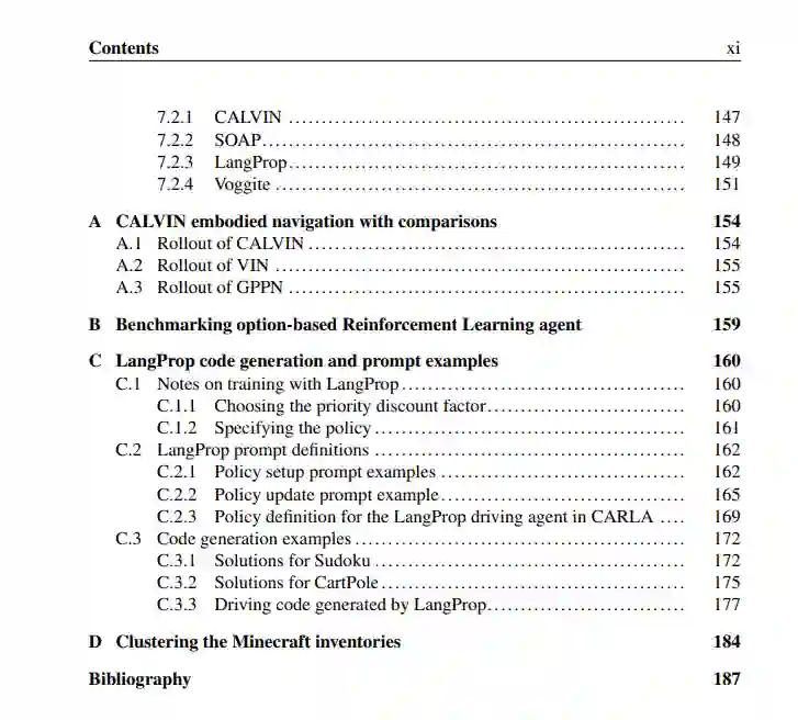 首先,CALVIN 是一个差分规划器,它学习可解释的世界模型用于长期规划。通过从专家示范中学习奖励(目标和障碍)和状态转换(机器人动力学),CALVIN 成功地在部分可观测的3D环境中导航,例如迷宫和室内房间。 其次,SOAP 是一种强化学习算法,用于无监督地发现用于长时间任务的宏观动作(选项)。选项将任务分解为子任务,并能够一致地执行这些子任务。SOAP 在基于历史条件的走廊任务以及经典基准如Atari上展示了强大的表现。 第三,LangProp 是一个使用大型语言模型(LLMs)解决具身智能体问题的代码优化框架,它通过将代码视为可学习的策略进行推理。该框架在CARLA自动驾驶基准测试中生成了可解释的代码,表现与人类专家编写的代码相当或更优。 最后,Voggite 是一个具身智能体,采用视觉到动作的Transformer后端,在Minecraft中解决复杂任务。它通过识别动作触发器,将任务分解为多个阶段,在MineRL BASALT竞赛中获得了第三名。 这些进展为基于学习的方法在复杂空间推理与规划挑战中的应用提供了新的途径。 关键词 — 机器学习,神经网络,深度强化学习,模仿学习,层次化强化学习,策略优化,机器人技术,自动驾驶,具身智能体,选项发现,技能学习,导航,规划,计算机视觉,大型语言模型,多模态基础模型。