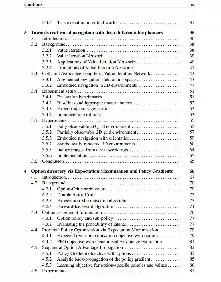 最后,本研究的目标是将开发的技术应用于与具身智能体相关的问题,例如机器人技术。在第3章、第5章和第6章中,解决了机器人导航、自动驾驶和虚拟世界Minecraft[208]中的任务执行挑战。这些挑战的关键元素是导航和空间推理。导航是一个现实世界中的问题,传统上通过专家设计的系统解决,但可以通过利用数据驱动的学习来提高效率。例如,车道变换和与其他车辆的合作是自动驾驶车辆需要复杂规划的任务。该问题特别困难,因为人类的合作行为难以建模,原因是复合因素和细微线索的存在,并且不总是有确定的策略可遵循。从现实世界数据中学习合作行为有助于优化这些任务。