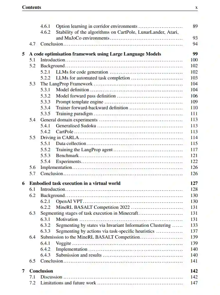 技能学习是高效探索、决策制定和解决任务的另一个重要组成部分。有了技能,可以构思一个将低级技能策略组合并协调起来的高级计划。这些技能专门用于解决任务的子集,使智能体能够通过将这些技能组合在一起,从较少的训练样本中学习解决复杂的新任务的方法。在第4章中探索了这些技能如何通过使用环境奖励作为学习信号以无监督方式学习。智能体的轨迹被分割为与技能相关的选项[166, 214],对应于特定子策略的技能。