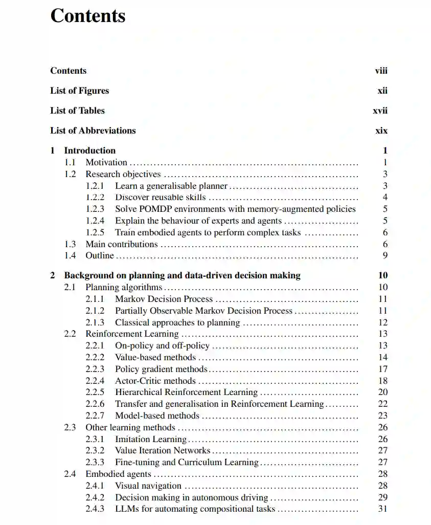 本研究的核心目标之一是开发能够泛化到新场景的可学习规划器。反应性马尔可夫策略与带有计划的策略的区别在于,反应性策略根据当前状态或局部观测做出即时决策,而规划涉及对给定情境进行长期分析,以提出空间和时间上一致的解决方案。 这两种方法的差异类似于文献[106]中提出的系统1(快速、无意识和自动决策)和系统2(缓慢、意识到且严谨的决策)的思维方式。两种决策过程都很重要,因为反应性策略在实时做出大量决策时很有用,而规划则确保决策的一致性和连贯性。例如,基于蒙特卡洛树搜索(MCTS)的算法[201, 202]在学习反应性策略和用于长期规划之间交替进行;蒙特卡洛树的回滚[40]被模拟,返回估计通过轻量级反应性策略进行反向传播,然后根据回滚结果更新该策略。 虽然诸如围棋和模拟环境的动态是已知的,但对于许多现实问题而言并非如此。基于模型的RL方法[75, 79, 190]通过学习环境模型来解决这一问题,该模型可用于模拟回滚。第3章探讨了相关的替代途径,学习一个可微规划器,解决在新环境中无法通过反应性策略有效解决的导航任务。第5章提出了一种通过将代码视为可学习策略,使用大型语言模型(LLMs)学习算法决策制定的新范式。通过使算法可学习,之前对于RL智能体来说过于复杂的高级和长期计划,现在可以通过模仿学习(IL)和RL技术来学习。此外,第4章和第6章展示了如何使用选项[166, 214]的时间抽象帮助智能体做出明智的长期决策,分别在1.2.2节和1.2.3节中讨论。